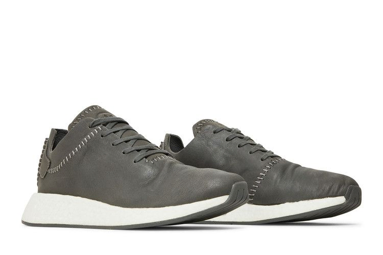 В модели wings+horns x NMD_R2 канадский бренд мужской одежды придает бегунам adidas деревенский вид. Минималистичные серые кожаные кроссовки без подкладки украшены простроченными вручную швами, что придает им незавершенный вид. На язычке вытиснен логотип adidas в виде трилистника, а язычок пятки из тональной кожи украшен заметной деталью в виде центральной строчки. Белая промежуточная подошва Boost контрастирует с большой заглушкой EVA и резиновой подошвой серого цвета.
