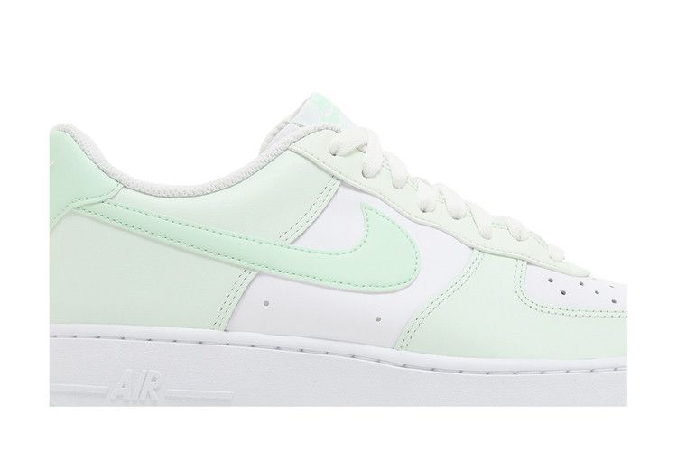 Модель Nike Air Force 1 Low "Mint Foam" выполнена из гладкой кожи и имеет белую основу с мятно-зелеными накладками на носке и пятке. Немного более темный оттенок зеленого цвета выделяет логотип Swoosh и задник, украшенный вышитым логотипом Nike. Детали наследия включают перфорированный мысок, шнуровку переменной ширины и резиновую подошву с амортизацией Air-sole в пятке.