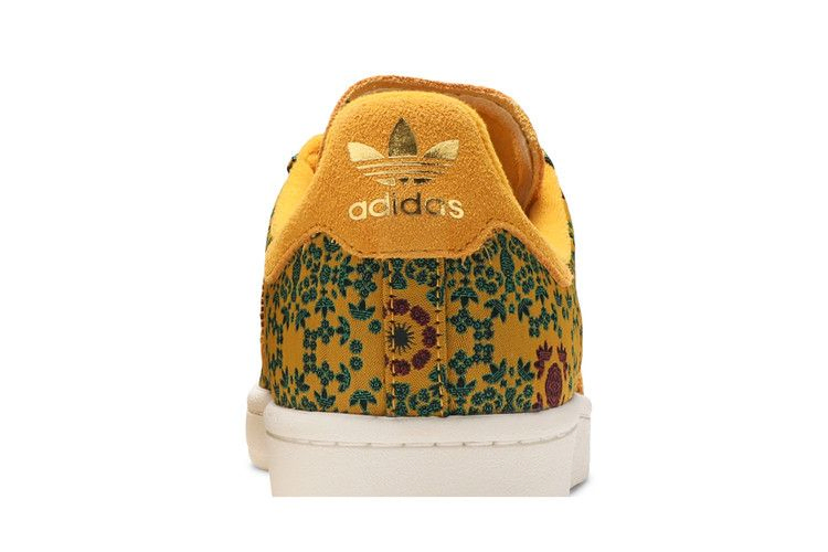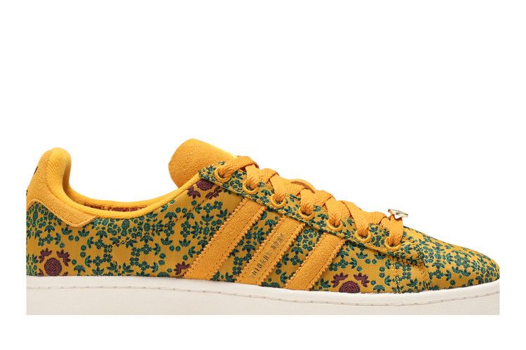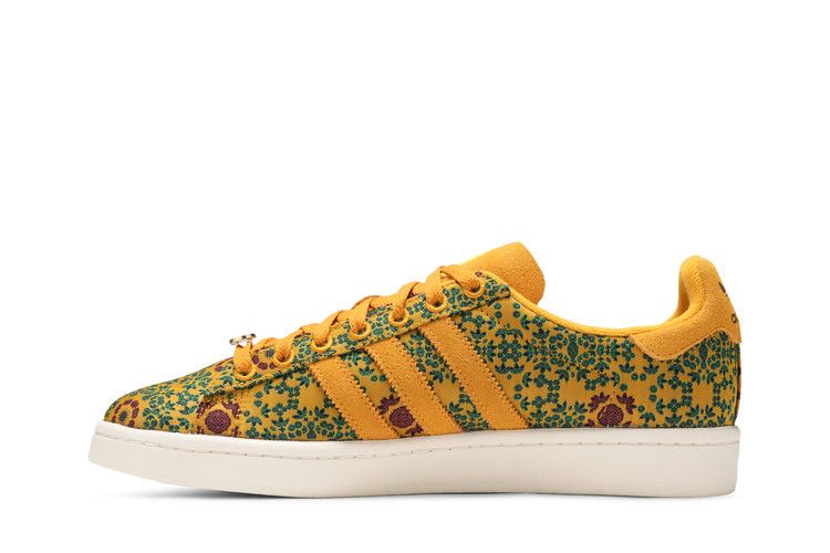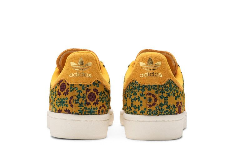 Модель Yara Shahidi x adidas Campus 'Floral' из коллекции одежды и обуви, созданной совместно с актрисой и активисткой, украшена золотистым текстильным верхом с замысловатым цветочным принтом зеленого и коричневого цветов, включающим трилистник adidas. Дополнительные детали включают золотые замшевые полоски, вышитые люверсы и золотые металлические украшения на шнурках. На правом язычке вышита персидская надпись "Yar", что в переводе означает "друг". Низкопрофильный силуэт стоит на белой резиновой подошве.