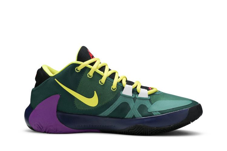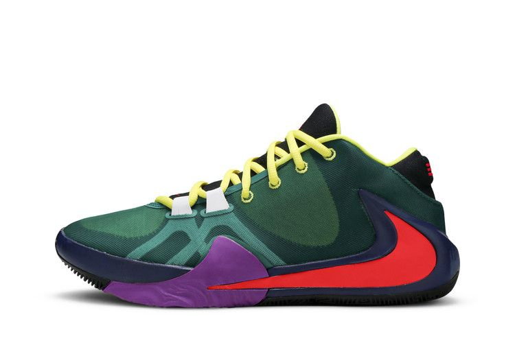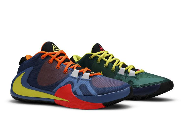 Zoom Freak 1 'Roots' придает фирменной обуви Джанниса Антетокумнпо привлекательный вид, подчеркнутый несочетаемыми цветами и различными яркими акцентами. Зеленый сетчатый верх левого кроссовка сочетается с синим сетчатым верхом правого кроссовка, оба усилены белыми внутренними полосами для фиксации передней части стопы. Подошва из черной резины обеспечивает разнонаправленное сцепление с поверхностью.