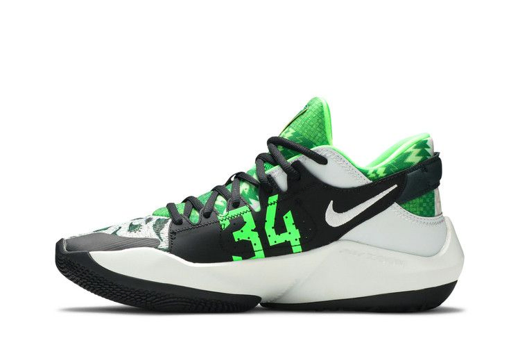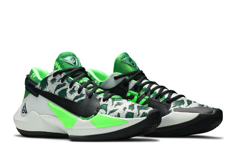 Дебютная расцветка второй фирменной обуви Джанниса Антокунмпо Nike Zoom Freak 2 "Naija" отличается характерными оттенками и текстурами, вдохновленными формой сборной Нигерии по футболу. Текстильный верх, усиленный формованной накладкой из TPU для дополнительной стабильности, опирается на промежуточную подошву из пеноматериала с амортизацией Zoom Air в передней части стопы. Подошва из черной резины обеспечивает гибкое сцепление с поверхностью.