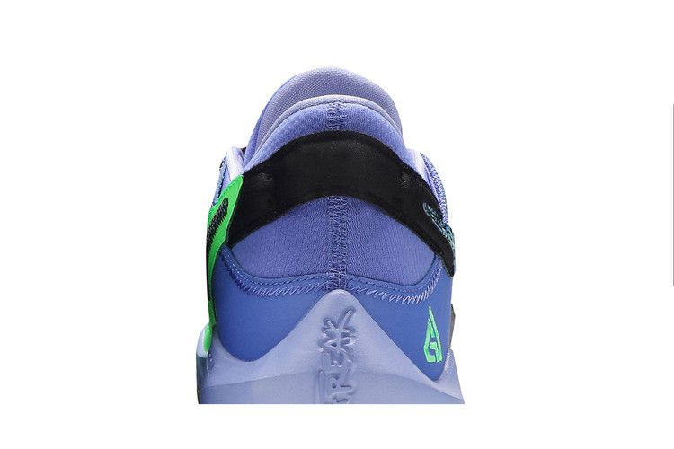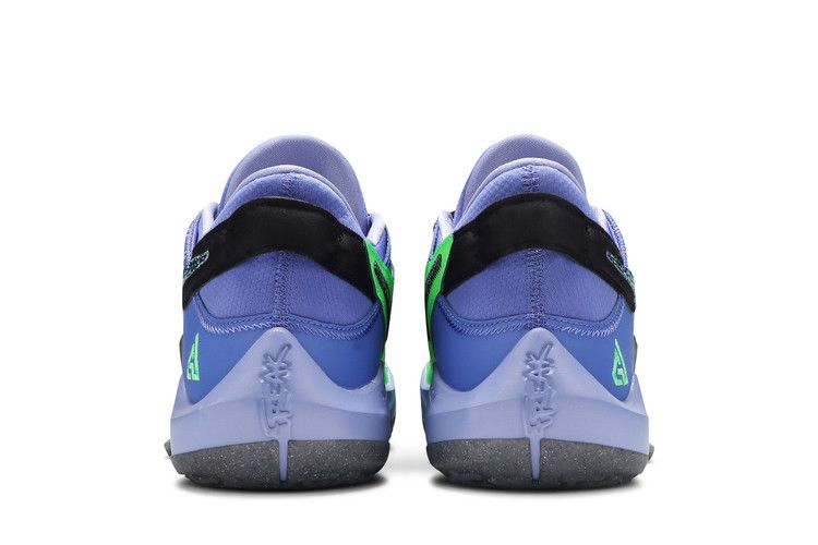 Модель Nike Zoom Freak 2 "Play for the Future" вдохновлена стремлением Nike Basketball воспитывать новое поколение звезд, которое разделяет и Джаннис Антокунмпо, деливший одну пару баскетбольных мячей между собой и своими братьями. Низкие кроссовки выполнены из текстиля сапфирового цвета, украшены неоново-зелеными деталями и установлены на промежуточную подошву, сочетающую мягкую пену и амортизацию Zoom Air в передней части стопы. Формованная деталь из TPU на боковой стороне предназначена для фирменного движения Джанниса Euro Step.