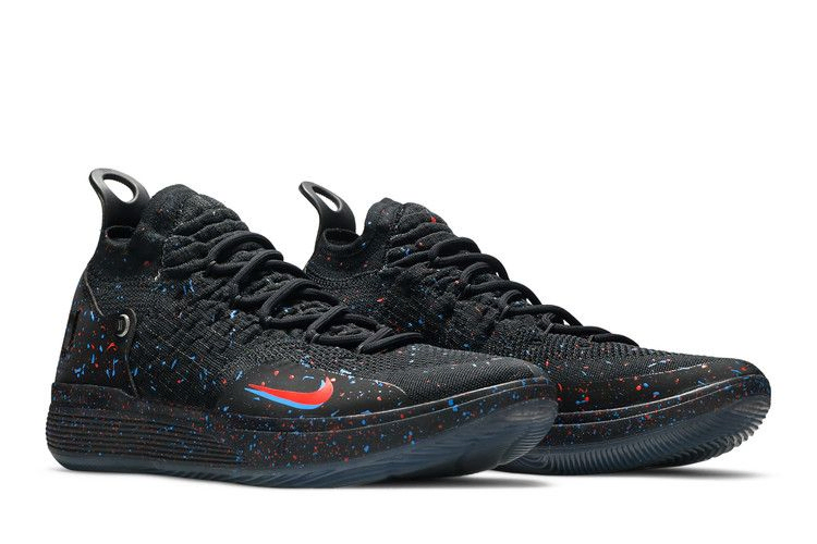 Модель Zoom KD 11 "Just Do It" посвящена давнему слогану Nike и украшена рисунком в виде конфетти, покрывающим черный верх Flyknit и черную подошву React foam. В дополнение к вкраплениям ярко-малинового и фотосинего цветов, на боковом носке кроссовок красуется двухслойная надпись Swoosh, а на пятке - тканая фирменная бирка Nike.