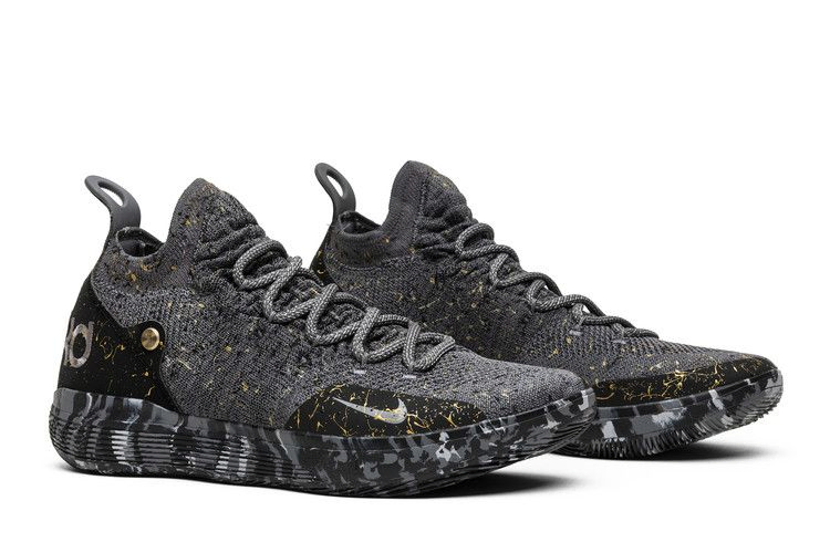 11-й фирменный силуэт Кевина Дюранта с Nike вдохновлен его любовью к повседневной носке Flyknit Racer. Верх кроссовок выполнен в угольном цвете и украшен золотыми вкраплениями, а пятка акцентирована металлической фурнитурой. Камуфляжная межподошва сочетает в себе технологии Nike React и Zoom Air, обеспечивая легкую амортизацию.