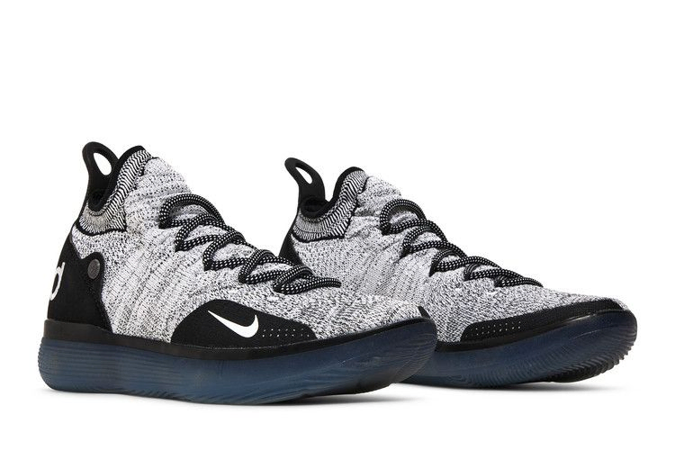 Для 11-й версии фирменных кроссовок Кевина Дюранта дизайнер Nike Лео Чейндж создал систему амортизации, в которой используется технология Nike Zoom Air и пена Nike React - впервые они сочетаются друг с другом, что позволяет сразу почувствовать привыкание. В модели Nike Zoom KD 11 "White Black" он поместил все это в ледяную голубую подошву, которая стала основой для черно-белого верха Flyknit с черными накладками и большим логотипом KD на пятке, дополненным черно-белыми контрастными шнурками и строчками.