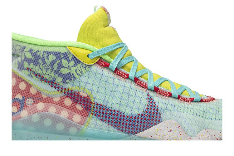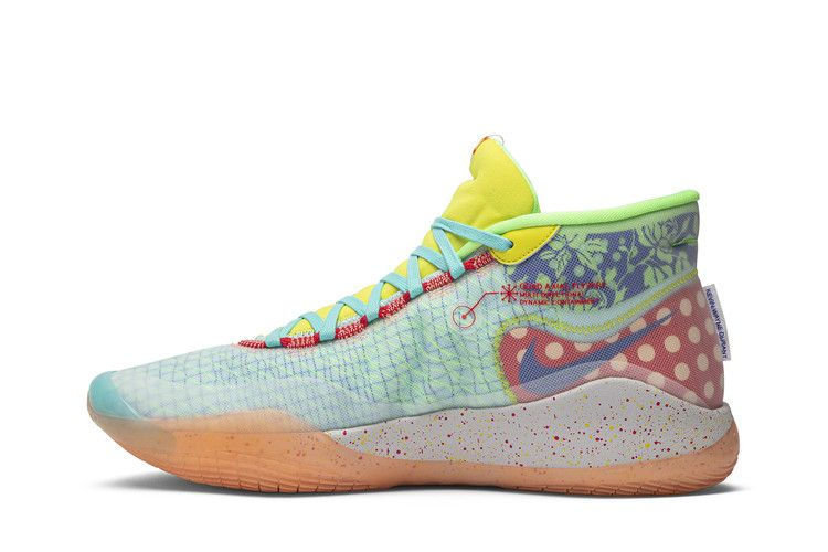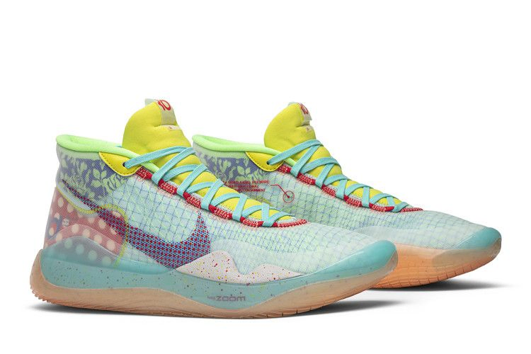 В преддверии ежегодного молодежного баскетбольного турнира Nike Peach Jam в Огасте, штат Джорджия, Nike выпустил Zoom KD 12 'EYBL Peach Jam' в июле 2019 года. Энергичная итерация легендарной обуви Кевина Дюранта для игры на корте в 2019 году, силуэт украшен яркими цветами. Верхняя часть из сетки и флайкнита содержит кабели Flywire для стабильности и разнонаправленного движения на площадке, а под ногами - полноразмерный блок Zoom Air, пришитый непосредственно к верху для дополнительной чувствительности внизу.