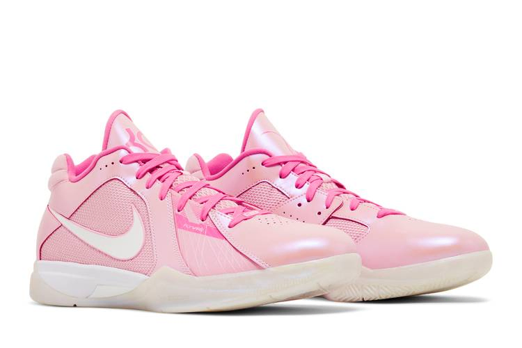 Ретро-модель Nike Zoom KD 3 "Aunt Pearl" получила пастельный оттенок в честь связи Кевина Дюранта с его любимой покойной тетей. Нежно-розовый оттенок заливает верхнюю часть, созданную из смеси кожи, сетки и синтетических материалов. На правом ботинке красуется личный логотип KD, а на левом - логотип фонда Kay Yow Cancer Fund. Легкая амортизация обеспечивается промежуточной подошвой Phylon, дополненной передним блоком Zoom Air, и поддерживается резиновой подошвой в форме елочки.