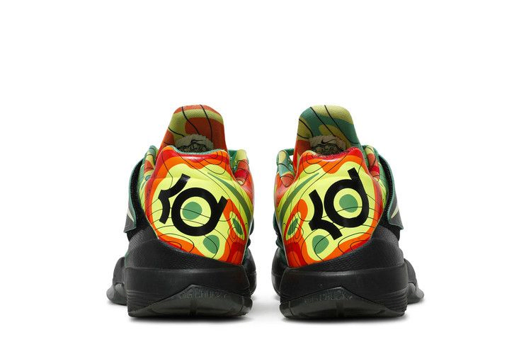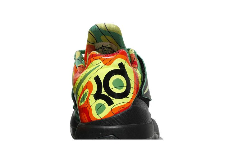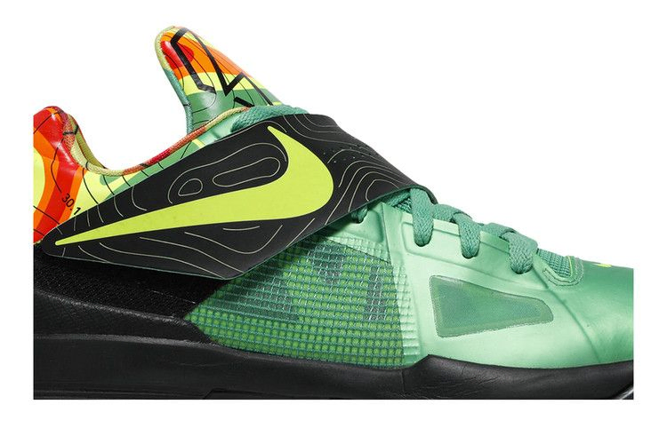 Вдохновленные детской мечтой Кевина Дюранта стать телевизионным метеорологом, лимитированные Zoom KD 4 "Weatherman" 2011 года выпуска отличаются пышным зеленым верхом с Volt Swoosh на среднем носочном ремне и графикой в стиле доплеровского радара на пятке. На одной стельке написано "The Forecast Calls for a Thunder Storm", а на другой - несколько погодных символов. Кроссовки также установлены на черную промежуточную подошву с полупрозрачной подошвой ледяного синего цвета, на которой изображены сканы следов KD, нанесенные на термокарту.