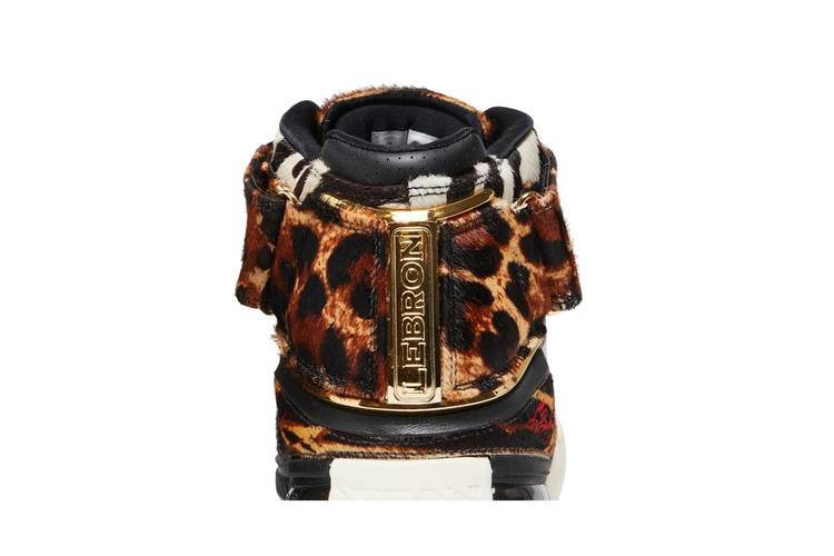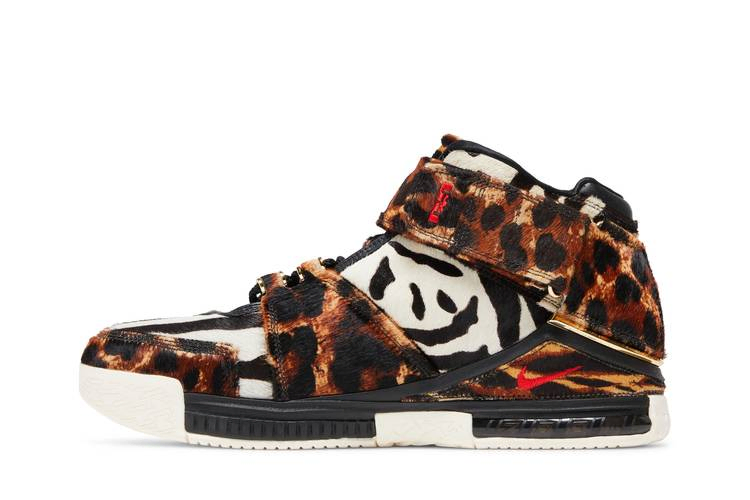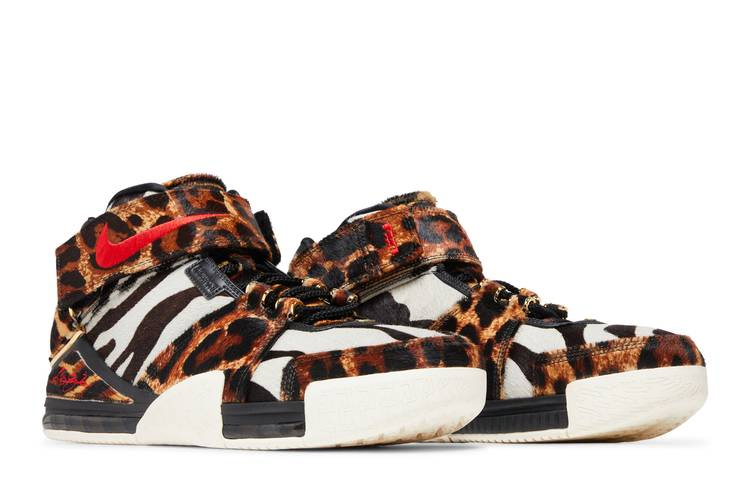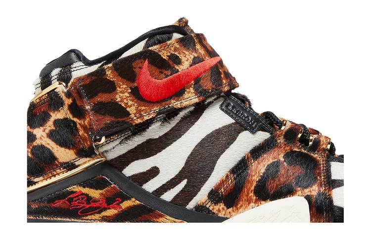 Модель Nike Zoom LeBron 2 "Beast", созданная на основе модели 2014 года PE, которая так и не была представлена публике, демонстрирует волосатый верх из смеси принтов гепарда и зебры. Малиновые акценты выделяют элементы брендинга, среди которых вышитый Swoosh на съемном ремешке на щиколотке и подпись Леброна Джеймса на боковой пятке. Кроссовки опираются на затемненную промежуточную подошву с пружинистой амортизацией Zoom Air в носочной и пяточной частях. Белая резиновая подошва обеспечивает надежное сцепление с поверхностью.
