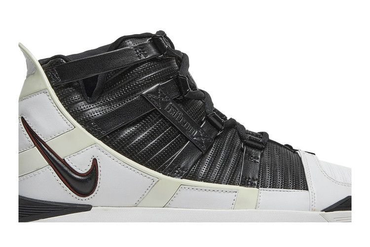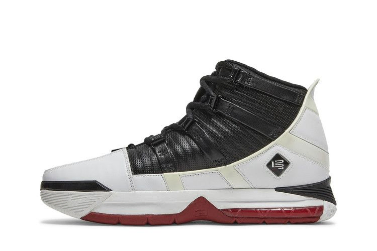 Дебют Zoom LeBron 3 в этой расцветке, вдохновленной Кавалерами, состоялся в 2005 году. Модель выполнена из белой и черной кожи и напоминает ботинки с мощной фурнитурой, ремешками на лодыжках и веревочными шнурками. Под ногами - объемный воздушный блок Zoom Air с усиленной оболочкой Pebax, окрашенный в красный цвет Varsity Crimson.