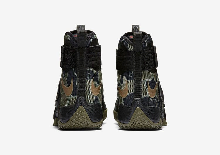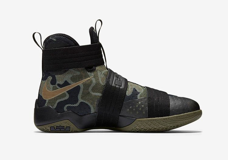 Армейский камуфляж LeBron Soldier 10 украшен принтом в стиле милитари. Силуэт с высокой вершиной оснащен сетчатым верхом, системой крепления без шнурков и амортизационными блоками Zoom Air в пятке и передней части стопы. Подошва, простирающаяся до нижней части межподошвы, обеспечивает сцепление с поверхностью. Брендинг LeBron James украшает средний ремешок, а реверсивный Swoosh выполнен в золотом цвете.