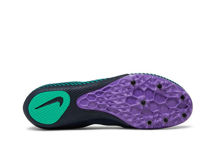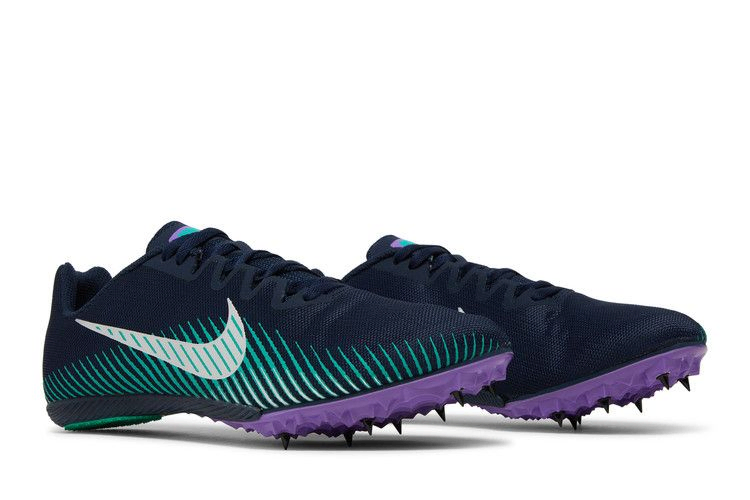 Nike Zoom Rival M 9 "Obsidian Wild Berry" с разноцветными акцентами - универсальные беговые шиповки для широкого круга соревнований. Дышащий верх из черной сетки оснащен аркой для поддержки средней части стопы и внутренним ботинком длиной 3/4 для плотной посадки, напоминающей носок. На боковой стороне серебристый металлический Swoosh сопровождается зональными синтетическими накладками цвета Clear Emerald. Подошва сочетает в себе фиолетовую шипованную пластину и текстурированную зеленую резину под пяткой.