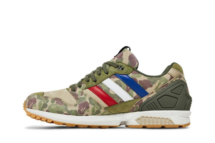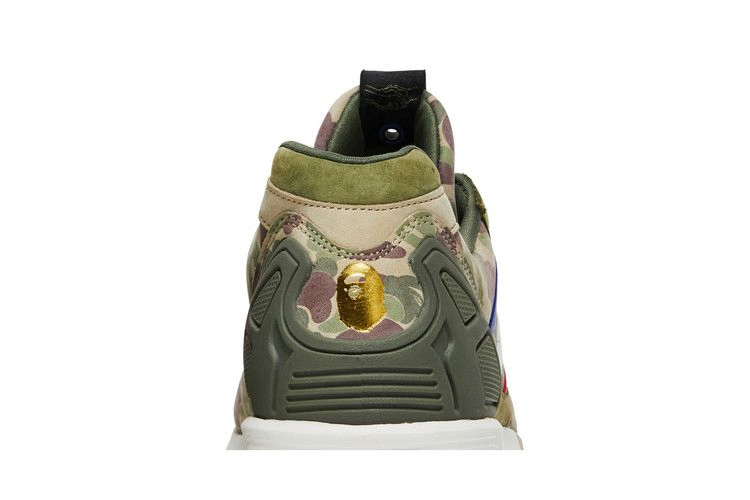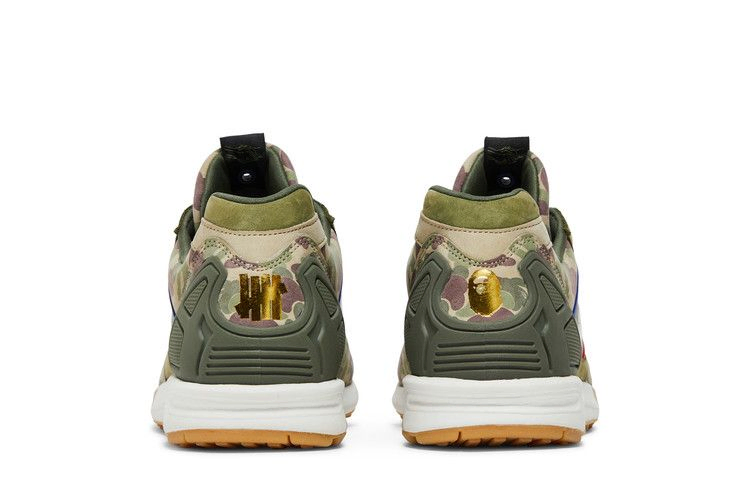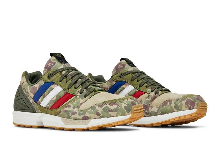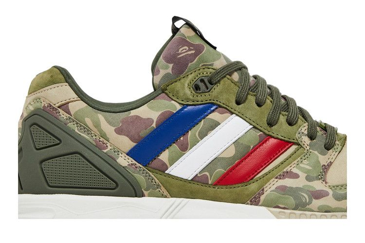 adidas объединился с японским стритвир-брендом BAPE и калифорнийским Undefeated для создания этой версии классических adidas ZX 5000 80-х годов от adidas Consortium. Модель украшена фирменным камуфляжным принтом Bape на замшевом верхе, оливково-зелеными панелями, кожаными трехцветными полосками и тисненым золотым кобрендингом на пятке. Кроме того, модель оснащена оливковым резиновым каблуком, системой амортизации Torsion в пятке и передней части стопы, а также подошвой из резины.