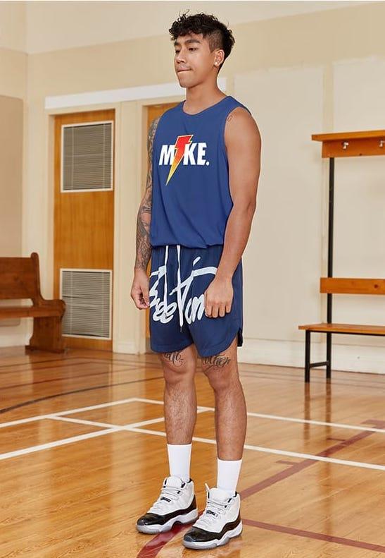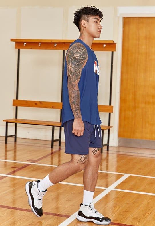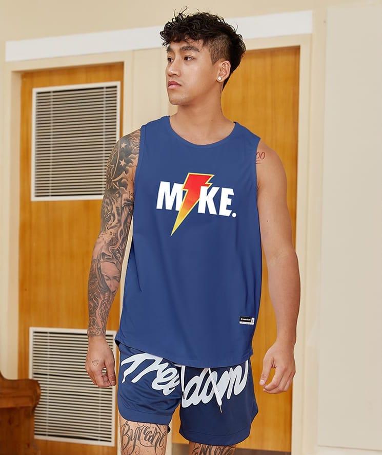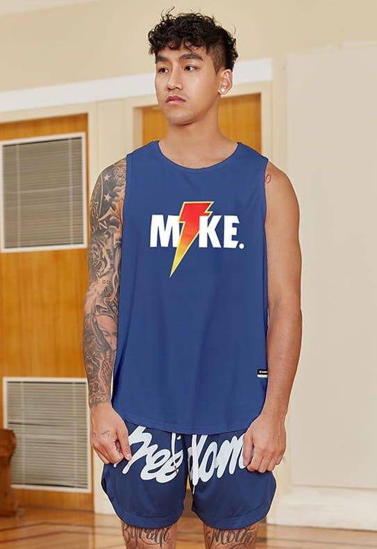 Майка Ehot Gatorade Mike Blue Top синего цвета имеет прямой крой с круглым воротом. На её груди есть контрастный принт бренда Gatorade с отсылкой к игроку Майклу Джордану, который участвовал в рекламе напитка. Темная майка сшита из быстросохнущей и комфортной ткани.