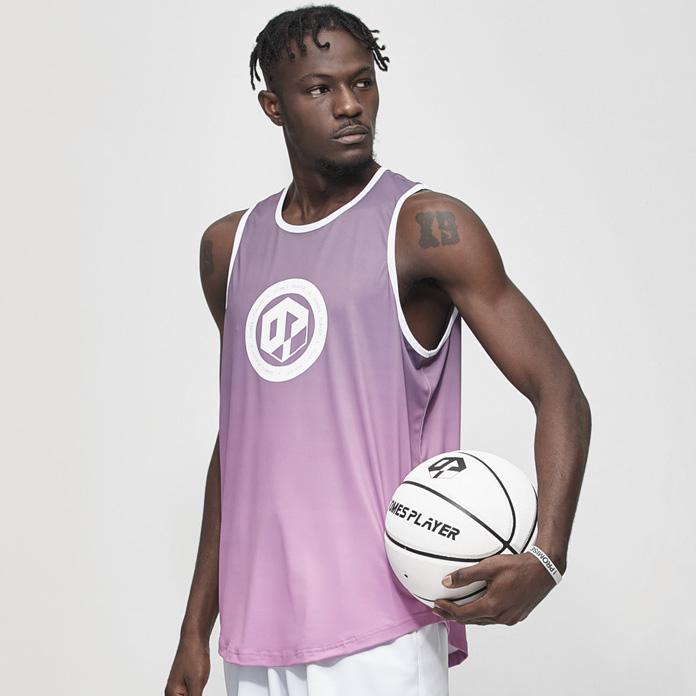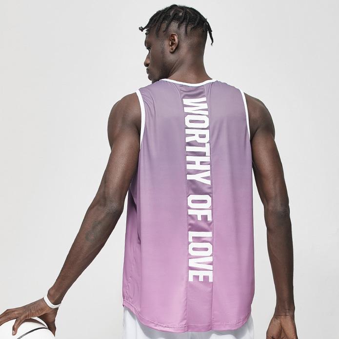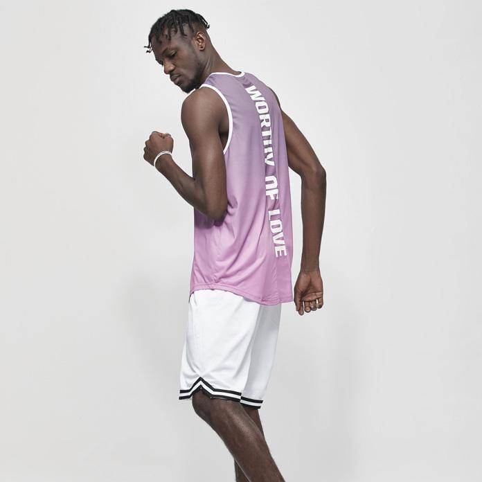 Майка Ehot Worthy Purple Undershirt градиентной сиреневой расцветки имеет прямой крой с круглым вырезом и белой окантовкой. На передней части и спине есть белый принт, а также крупная вертикальная надпись. Майка превосходно подходит для занятия спортом, так как не стесняет движений и изготовлена из быстросохнущего материала.
