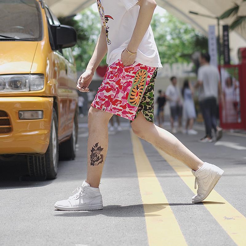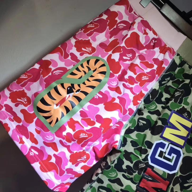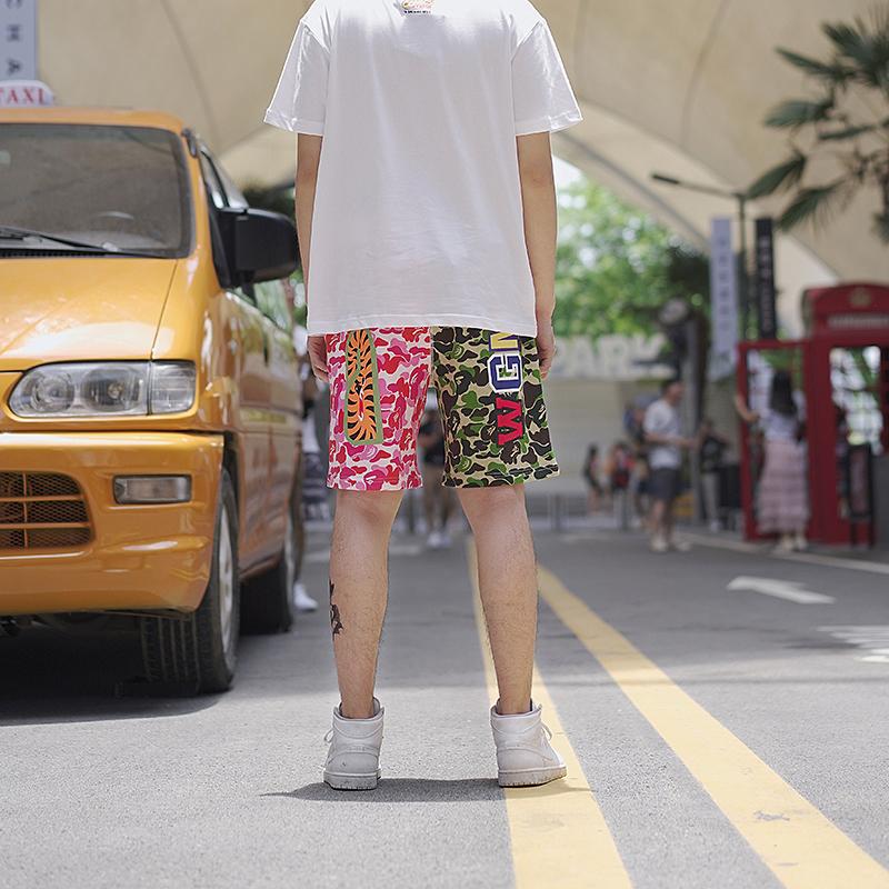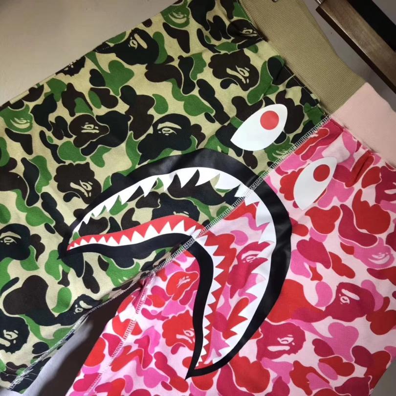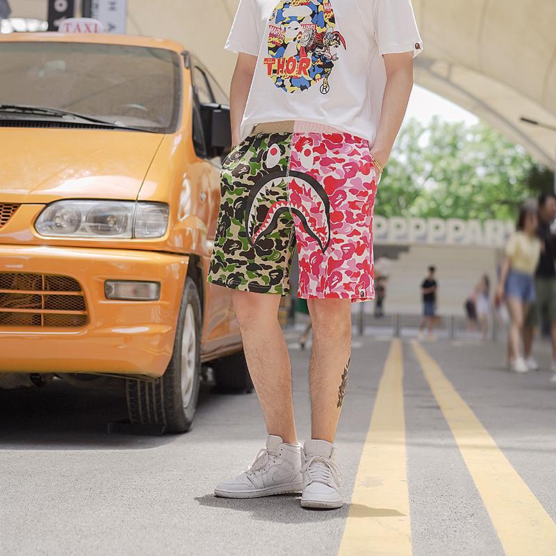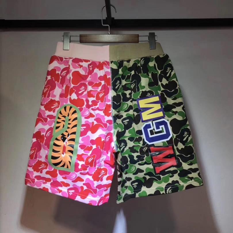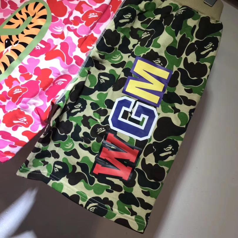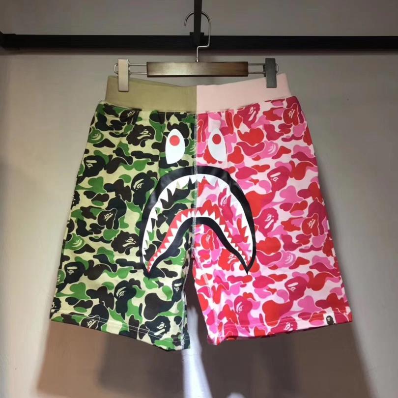 Шорты японского бренда BAPE в двойной расцветке - зелёный и розовый камуфляж. На штанинах красуются фирменные логотипы с акулой.- Материалы: хлопок