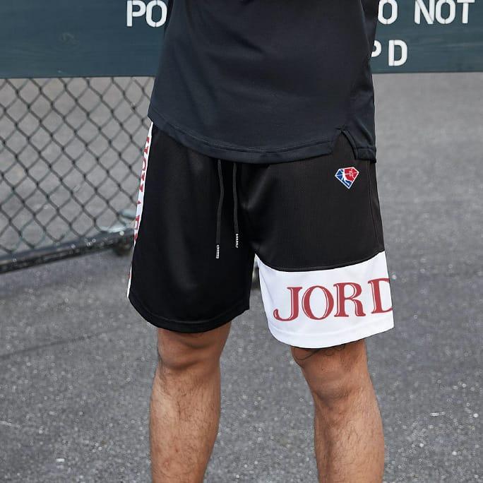 Шорты Ehot Jordan Stripe Black Shorts черного цвета с широкими белыми полосками и красной надписью Jordan удобны для спорта и повседневной носки. Шорты длиной до колена из эластичной сетчатой ткани отличаются прочностью и пропускают воздух.