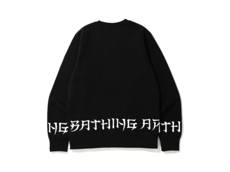 Толстовка BAPE A Bathing Ape Lettered Crewneck Black сделана из высококачественного материала в черном цвете. Она сделана из качественного хлопка с ребристой отделкой и вышитым логотипом на груди в форме узнаваемой головы обезьяны. По низу толстовки есть надписи A BATHING APE в стиле иероглифов. Она сочетается со спортивной одеждой и уличным стилем Токио.