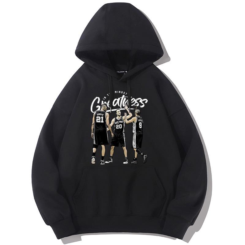 Толстовка DPOY Greatness GDP Spurs Hoodie изготовлена из плотного трикотажа с флисовой подкладкой. Однотонное худи с карманом впереди дополнено контрастным рисунком с тремя легендарными игроками Spurs на груди и номерами игроков на спине.