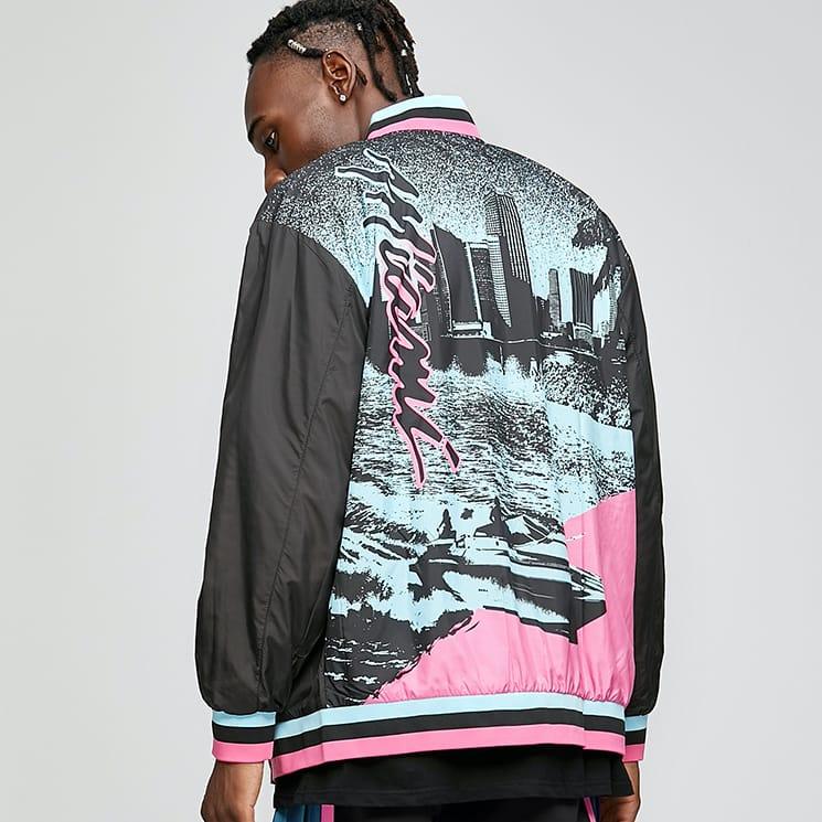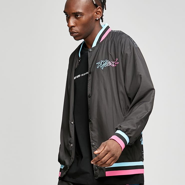 Бомбер Ehot Miami City Black Bomber придется по вкусу фанату баскетбола и клуба Miami Heat. Спина куртки украшена розово-голубым принтом с символикой команды и фото города, а грудь - символикой клуба. Трикотажные манжеты и воротник в цветах команды гармонично дополняют образ. Бомбер застегивается на кнопки и подходит для любой погоды