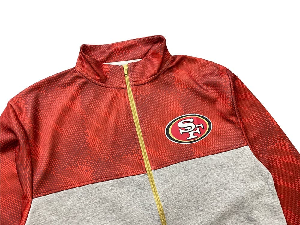 Куртка B20THER NFL 49ers Red Jacket с воротником-стойкой красного цвета обладает свободным кроем с серой нижней частью и желтыми акцентами. На передней части располагается принт в цветах команды NFL. Комфортная куртка прекрасно подходит для тренировок, так как не ограничивает движений и изготовлена из быстросохнущего полиэстера.