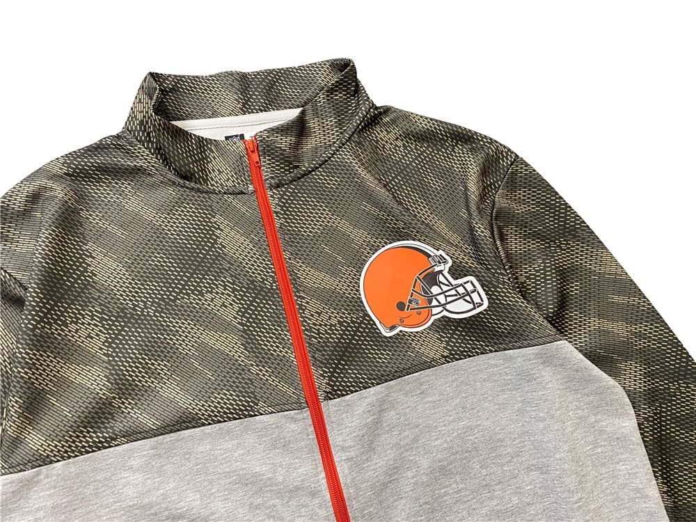 Куртка B20THER NFL Browns Brown Jacket коричневого цвета обладает свободным кроем с серой нижней частью и красными акцентами. На передней части располагается принт в цветах команды NFL Браунс, замок на молнии и воротник-стойка. Комфортная куртка прекрасно подходит для тренировок, так как не ограничивает движений и изготовлена из быстросохнущего полиэстера.
