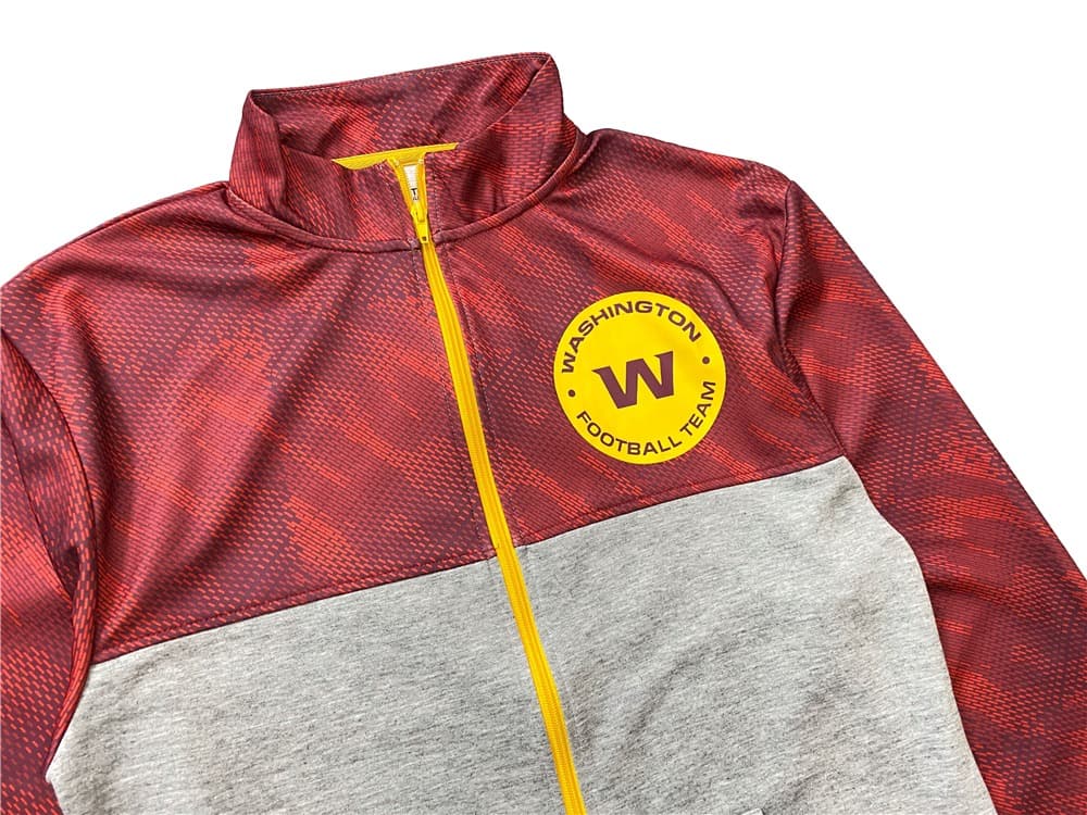 Куртка B20THER NFL Commanders Red Jacket красного цвета обладает свободным кроем с серой нижней частью и желтыми акцентами. На передней части располагается принт в цветах команды NFL Коммандерс. Комфортная куртка прекрасно подходит для тренировок, так как не ограничивает движений и изготовлена из быстросохнущего полиэстера.