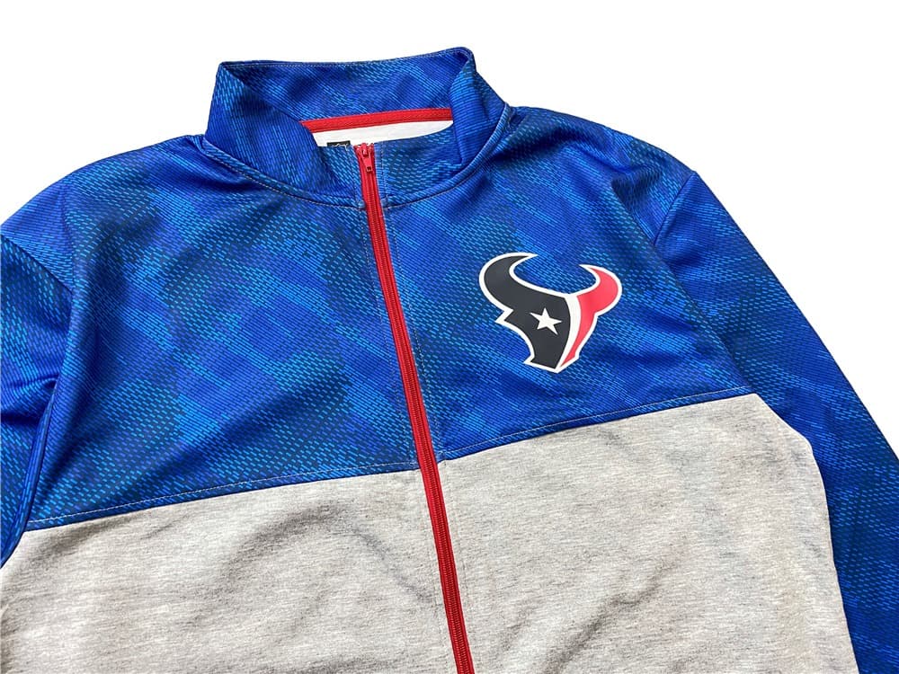 Куртка B20THER NFL Texans Blue Jacket синего цвета обладает свободным кроем с серой нижней частью и красными акцентами. На передней части располагается принт в цветах команды NFL Тексанс. Комфортная куртка прекрасно подходит для тренировок, так как не ограничивает движений и изготовлена из быстросохнущего полиэстера.