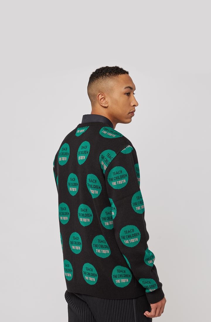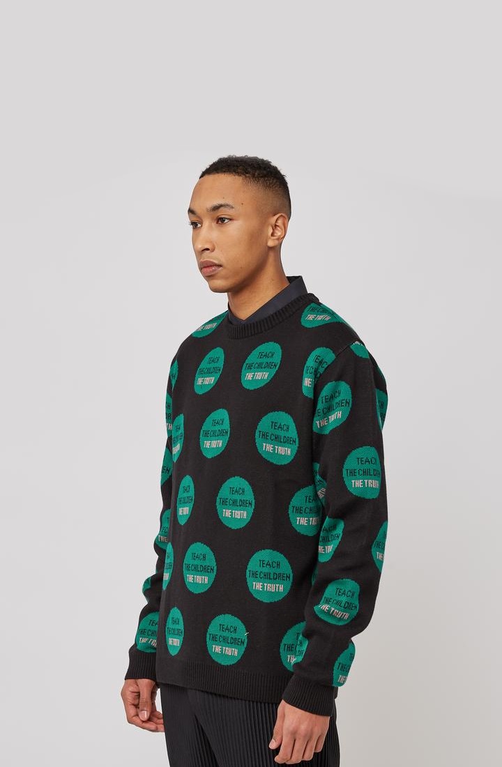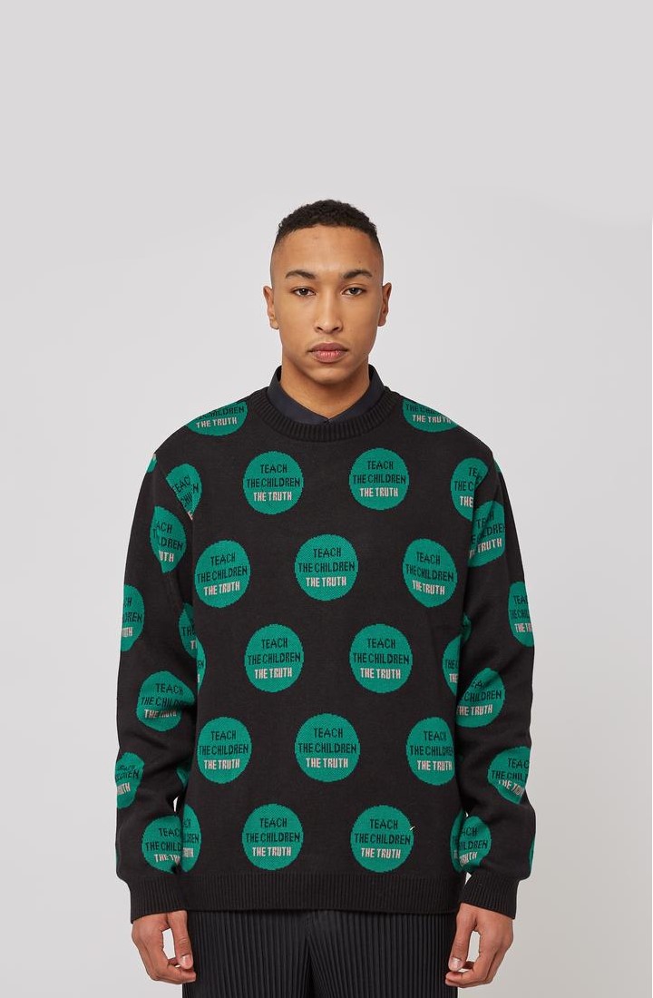 Свитер Awake Truth Pullover Sweater Black создан из высококачественного материала в черном цвете. Awake NY оживляет вязаный свитер с помощью сплошного узора, несущего послание - «Учите детей правде». Манжеты, подол и воротник украшены трикотажной резинкой в ​​тон. Добавьте индивидуальности в свой гардероб с помощью этого мягкого свитера!