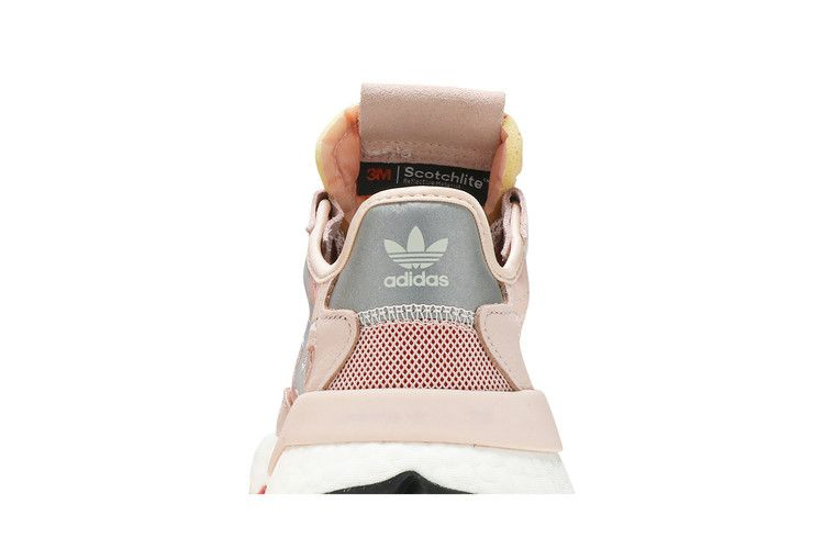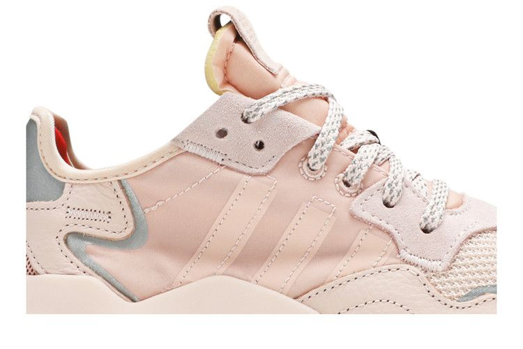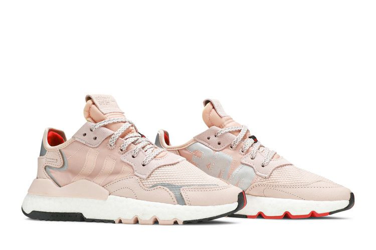 3M x adidas Wmns Nite Jogger - первые светоотражающие бегуны немецкого бренда, возрожденные для современных улиц. Представленный в октябре 2019 года женский вариант в цвете Vapour Pink одет в нейлон и сетку, детализированную светоотражающими элементами и панелями из кожи с потертостями. Современные изменения включают в себя графику азбуки Морзе на язычке, литой TPU-клип на пятке и вшитые трехполосные полосы. Промежуточная подошва Boost и трехцветная резиновая подошва обеспечивают мягкую поддержку.