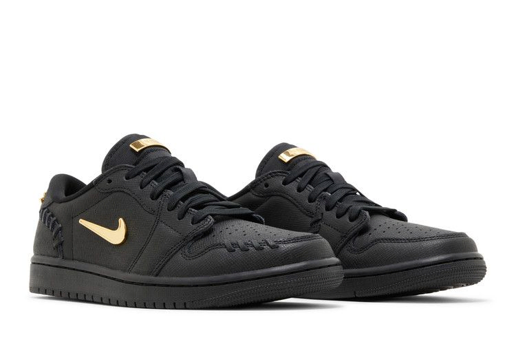 Женские кроссовки Air Jordan 1 Low Method of Make 'Black' имеют черный кожаный верх, украшенный крупными деталями стежков на носке и пятке. Золотисто-металлический Swoosh украшает четверть кроссовка, сочетаясь с литым логотипом Wings на язычке и надписью Air Jordan на пятке. Розовая резиновая подошва дополнена подошвой Air-sole, заключенной в полиуретановую танкетку.