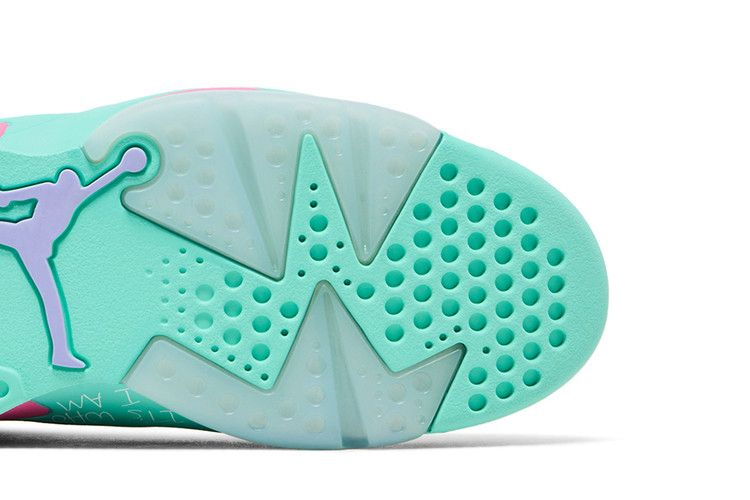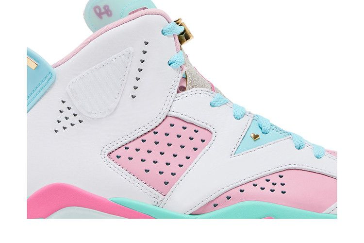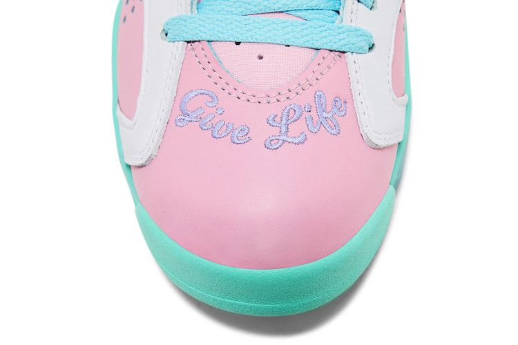 Модель Wmns Air Jordan 6 Retro "Doernbecher 2025" демонстрирует асимметричное сочетание цветов, вдохновленное дизайнером обуви Джиллиан Бигли, которая регулярно надевала несочетаемые Jordans на баскетбольную площадку. Кожаный верх сочетает белые накладки с чередующимися базовыми цветами бирюзового и розового. Воротник можно украсить вышитыми нашивками, а на мыске вышита надпись "Give Life". На задней пятке розовый Jumpman сопровождается словом "Gold" - кивок в сторону веры Джиллиан в то, что каждый человек - "чистое золото", когда он верен себе. Этот тезис отражен в золотых металлических акцентах, которые присутствуют на замках шнурков, крышке шнурков и язычке пятки. Надпись "Sports Are My Joy" ("Спорт - моя радость") находится на медиальной средней подошве левого ботинка, а надпись "It's Who I Am" ("Это то, кто я есть") - на правой медиальной средней подошве.