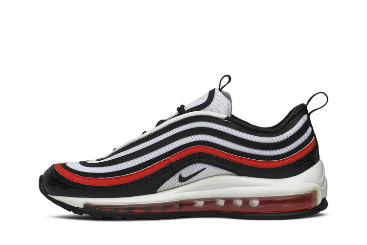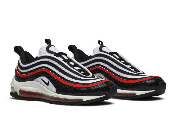 Компания Nike отметила 20-летие Air Max 97 выпуском модели Ultra '17. Обновленная модель изменила дизайн OG, использовав сетку и трикотаж. В этом женском размере "Chicago Bulls" красная отделка сочетается с черной кожаной накладкой с тиснением под кожу рептилии.