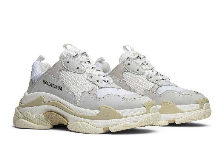 Кроссовки Balenciaga Triple S Trainer, ставшие первопроходцами в области кроссовок с неуклюжей подошвой, получили свое название благодаря фирменной подошве с тремя зубцами. Стратегически сложный силуэт с большим количеством набивки и слоев называется "White", но в нем присутствуют кремовые и бежевые элементы. Вышивка на носке, указывающая на размер, и всевозможные детали с эффектом дистресса завершают уникальный образ.