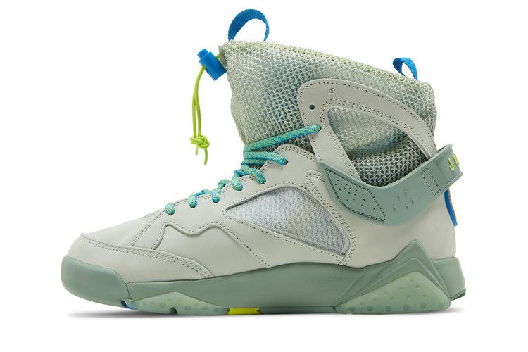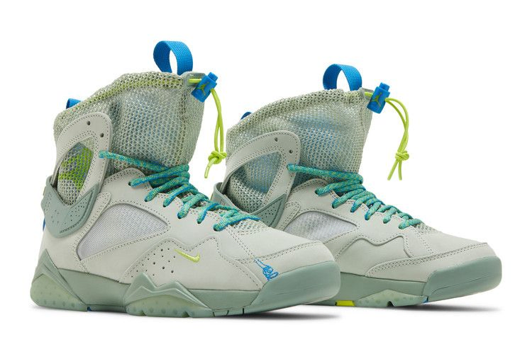 Женские Air Jordan 7 Retro 'Seafoam' от Bephies Beauty Supply x женские Air Jordan 7 Retro 'Seafoam' являются спутником коллаборации партнеров по бренду 'Sand Drift' Jordan 7. Переосмысленный дизайн Бет Гиббс подчеркивается открытым внутренним рукавом из сетки, который поднимается вверх по воротнику, где он фиксируется застежкой-тоглом. Верхняя часть выполнена из нубука бледно-зеленого цвета с вентилируемым текстилем на четвертной панели. Напоминающий Nike Air Huarache литой ремешок с тисненой надписью Air Jordan обвивает пятку, частично скрывая круглый значок BBS синего и желтого цветов. Под ногами полупрозрачная зеленая резиновая подошва с фирменным рисунком сцепления Jordan 7 и крупным брендингом Jumpman.