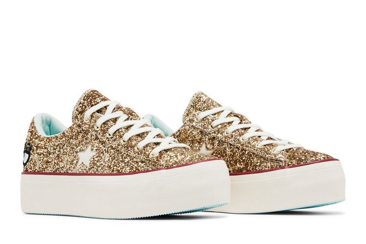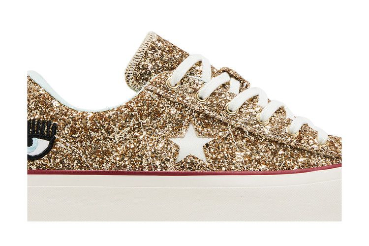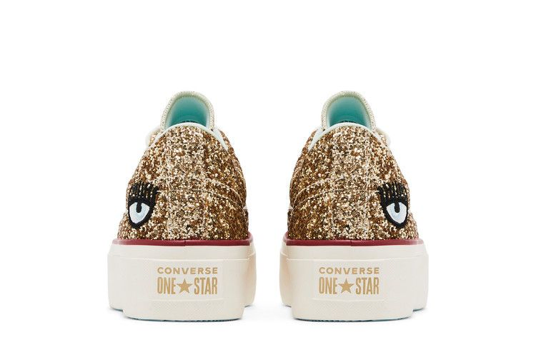 Компания Converse и Кьяра Феррагни, икона моды и популярный блогер, объединили свои усилия, чтобы выпустить современное обновление оригинальной модели Converse One Star. Модель Converse Chiara Ferragni x Wmns One Star Platform OX 'Gold Glacier Blue' имеет блестящий золотой верх с классическим брендингом в виде звезды, а также фирменный логотип в виде глаза блогера на пятке. Белоснежная резиновая подошва с красной лисьей лентой обеспечивает высоту и контраст этого блестящего женского эксклюзива.