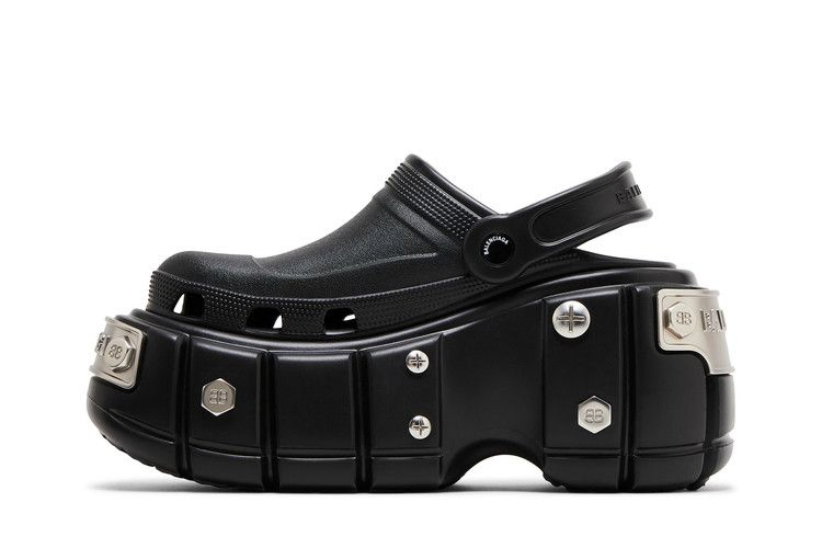 Crocs x Balenciaga Women's Hardcrocs Slide 'Nero Silver' - это модная интерпретация повседневных слипонов от испанского бренда класса люкс. Верх из формованной черной пены оснащен вращающимся ремешком на пятке с тисненым брендингом Balenciaga. Серия вентиляционных отверстий вдоль передней части стопы обеспечивает улучшенную воздухопроницаемость. Мюли стоят на платформенной подошве, украшенной декоративными шипами и металлическими шильдиками на носке и пятке.