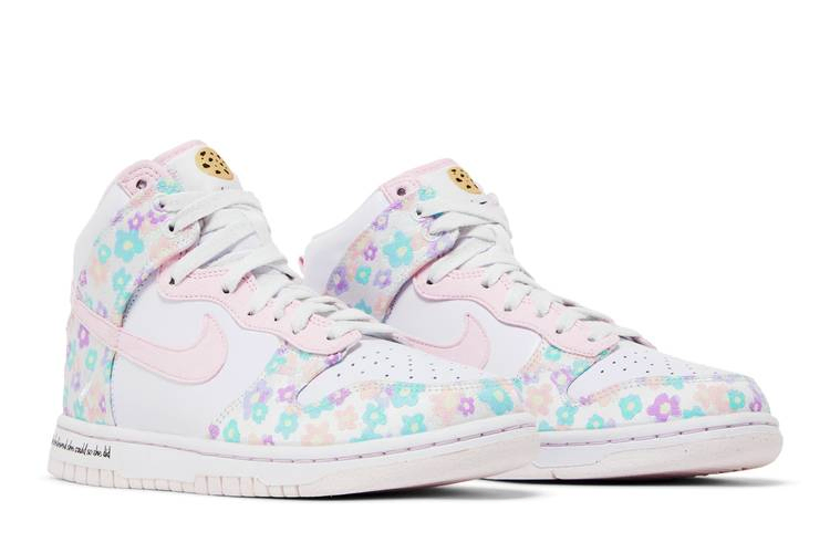 Эти Nike Dunk High, выпущенные в рамках коллекции Doernbecher Freestyle XIX, созданы дизайнером Мэйси Бодили. Верхняя часть из белой кожи, розовая замша Swoosh и текстильные накладки с цветочным принтом, нарисованные вручную Мейси. Вышитая серая ленточка на боковой пятке свидетельствует о том, что 15-летняя девушка пережила рак мозга, а ее любимый десерт - шоколадное печенье - изображен на тканом язычке. Модель стоит на бледно-лавандовой подошве с вдохновляющей фразой "Она верила, что сможет, и сделала это".