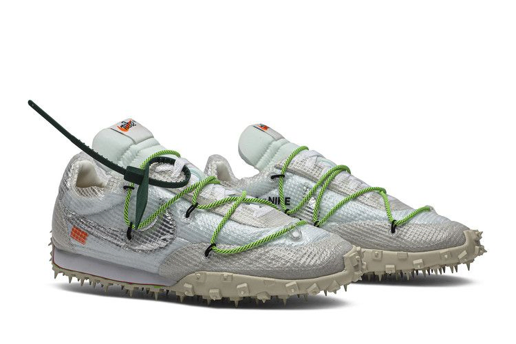 Off-White x Nike Wmns Waffle Racer из тройного выпуска, объединившего техническое вдохновение Вирджила Аблоха с ретро-духом бега. Эта женская версия имеет двухцветный верх из полупрозрачного материала, шнурки цвета Electric Green и металлический Swoosh с фирменным флагом на боковой стороне. Дополнительный брендинг расположен на язычке. Подошва из пеноматериала и шипованная подошва Waffle.
