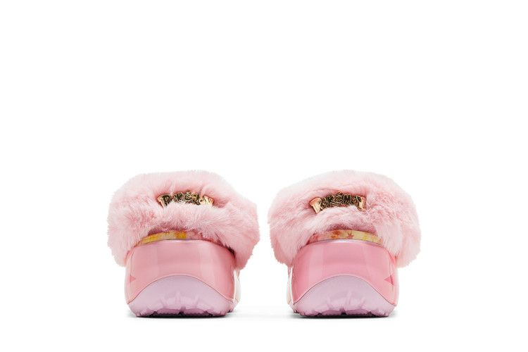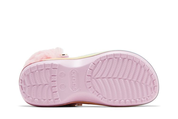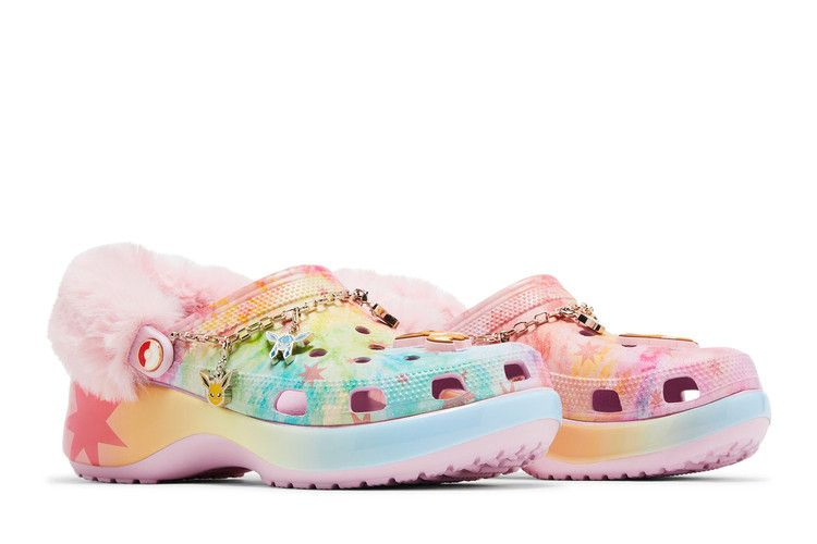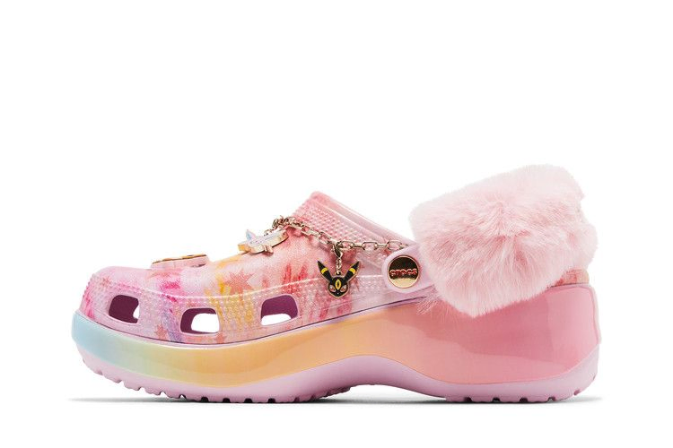 Женские ботинки Pokémon x Crocs Classic Platform Clog 'Eevee' украшены вихревым сочетанием розового, желтого и бирюзового цветов в верхней части из формованной пены Croslite. Модель оснащена пушистым розовым ремешком на пятке, который закреплен заклепками с логотипом покебола. Вокруг воротника нанизана золотисто-металлическая цепочка, украшенная эмалевыми брелоками в духе покемонов. Сабо стоят на платформе с градиентной многоцветной подошвой.