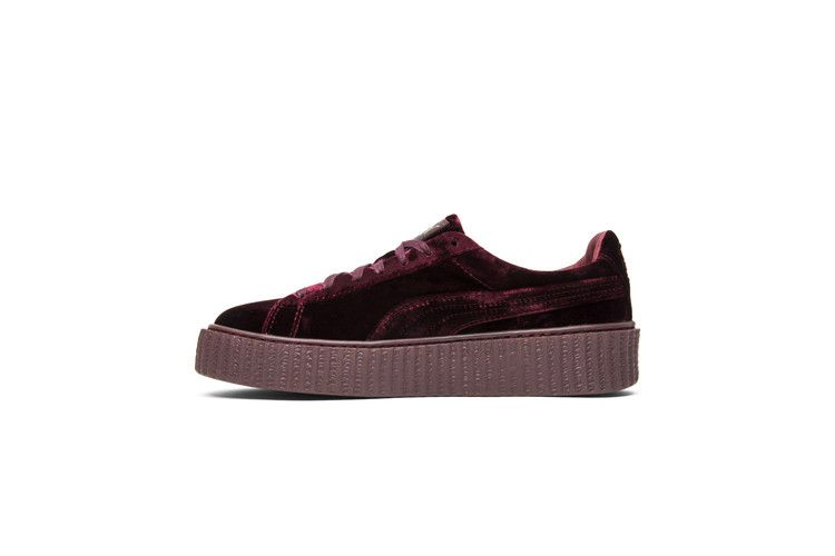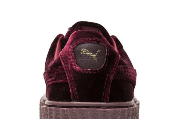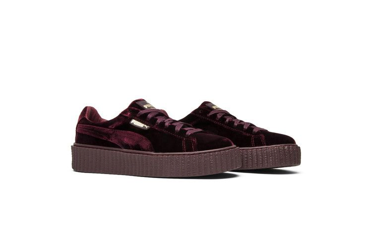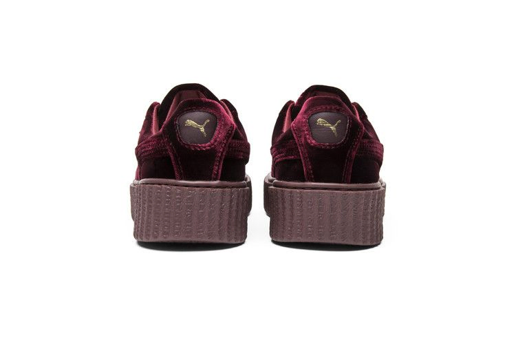 Модель FENTY Puma x Rihanna Velvet Creeper 'Burgundy' имеет полностью бордовый бархатный верх, подошву на платформе и золотой брендинг. Кроссовки были выпущены в декабре 2016 года в трех экземплярах, наряду с черным и цементным цветами.