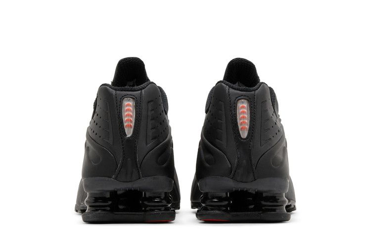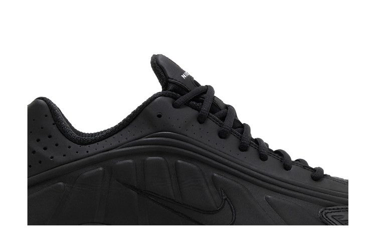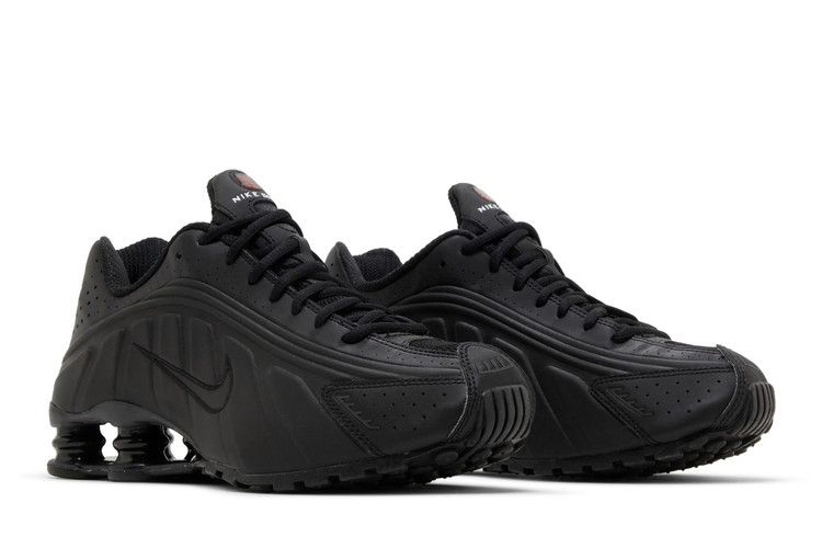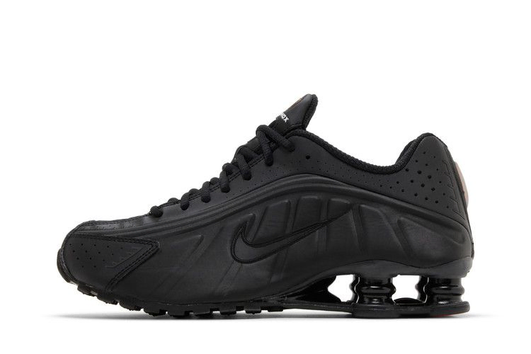 Инновационные кроссовки Nike Shox 2000 года были возвращены для переиздания Shox R4 'Black' в апреле 2019 года. Верх из синтетики и кожи украшен дышащей перфорацией и скульптурными накладками в средней части стопы. Под ногами между двумя пластинами Pebax расположены плотные и прочные пеноматериалы, обеспечивающие мягкость и отскок.