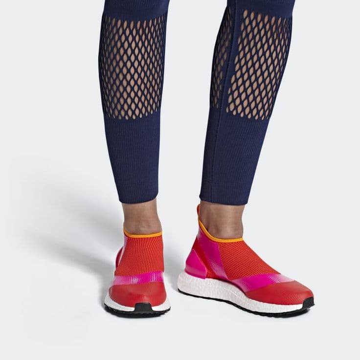 Стелла Маккартни переработала культовую модель adidas Ultra Boost в универсальные кроссовки, которые имеют средний покрой и нескользящую конструкцию. Созданная из переработанной полиэфирной пряжи, обувь стоит на полноразмерной мидсоли Boost и подошве Continental Rubber. Яркая расцветка представлена с матовыми и блестящими накладками Shock Pink и Core Red.