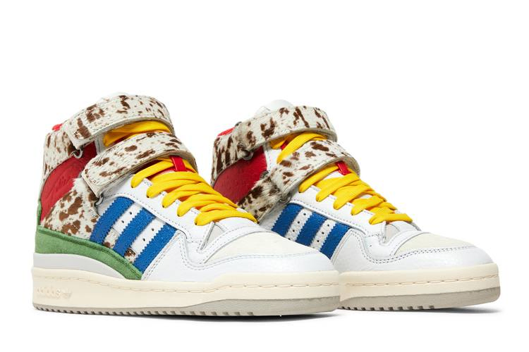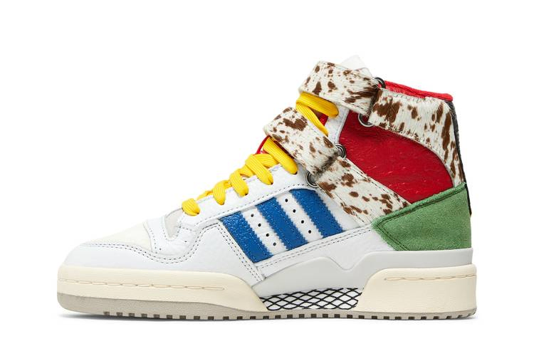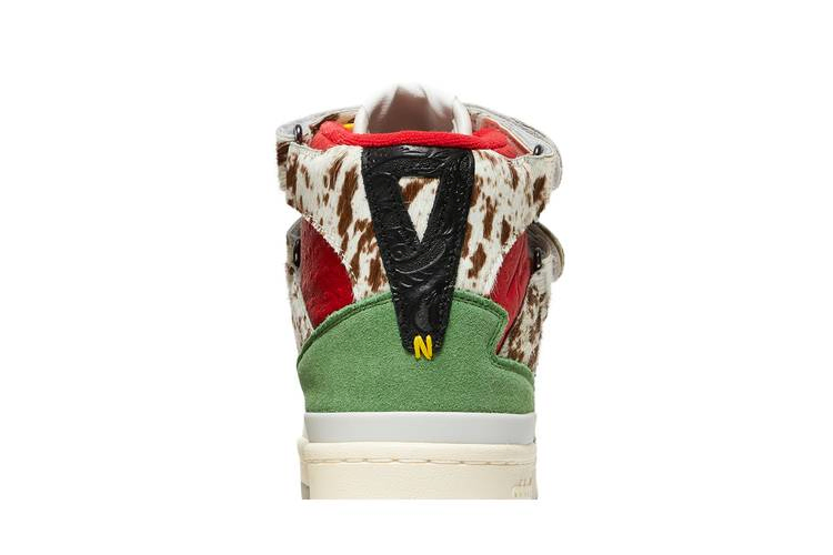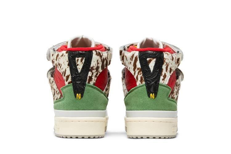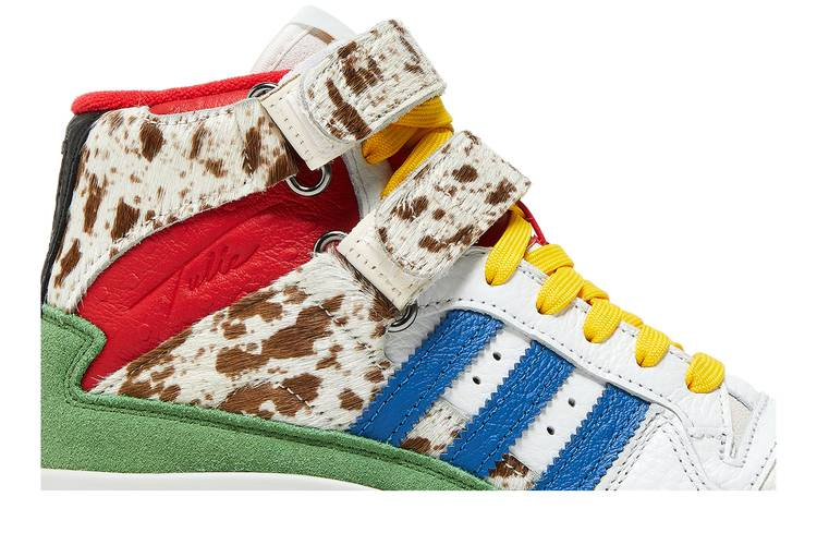 Модель Tulie Yaito x adidas Women's Forum 84 High "Wearable Luxury" представляет собой модный подход нью-йоркского дизайнера к винтажным кроссовкам. Желтые шнурки фиксируют верх из белой кожи с контрастными синими полосками и удлиненной пяткой из зеленой замши. Пара регулируемых ремешков с крючками и петлями огибает высокий воротник из фактурной красной кожи, покрытый пестрой шерстью пони. Кроссовки имеют прочную подошву с винтажными боковыми стенками и серой резиновой подошвой.