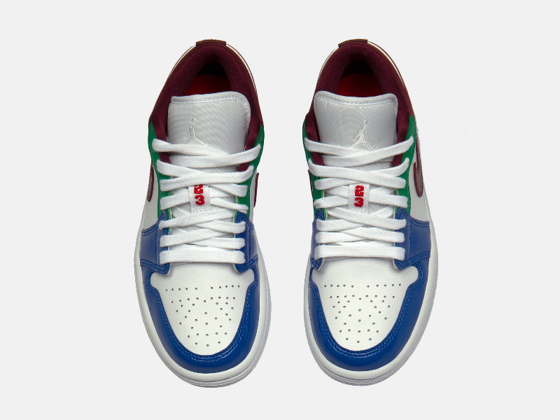 Женские кроссовки Air Jordan 1 Low «Multi-Color» с низким верхом придают смелый новый вид первой фирменной обуви Майкла Джордана благодаря своему дизайну, комфорту и удобству ношения. Перфорированный мысок и средняя панель верха отделаны белой кожей. Блестящая лакированная кожа украшает переднюю часть стопы, люверсы. Джордан Бренд смешал стиль этого дизайна, разместив красный кожаный Swoosh по бокам и белую вышивку «Wings» на пятке. Воротник выполнен из зеленой кожи, контрастирующей с оранжевой подкладкой.- Цвета: White/Hyper Royal/Lucky Green/Dark Beetroot