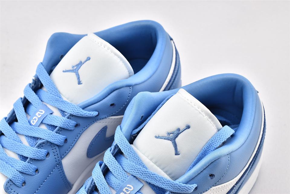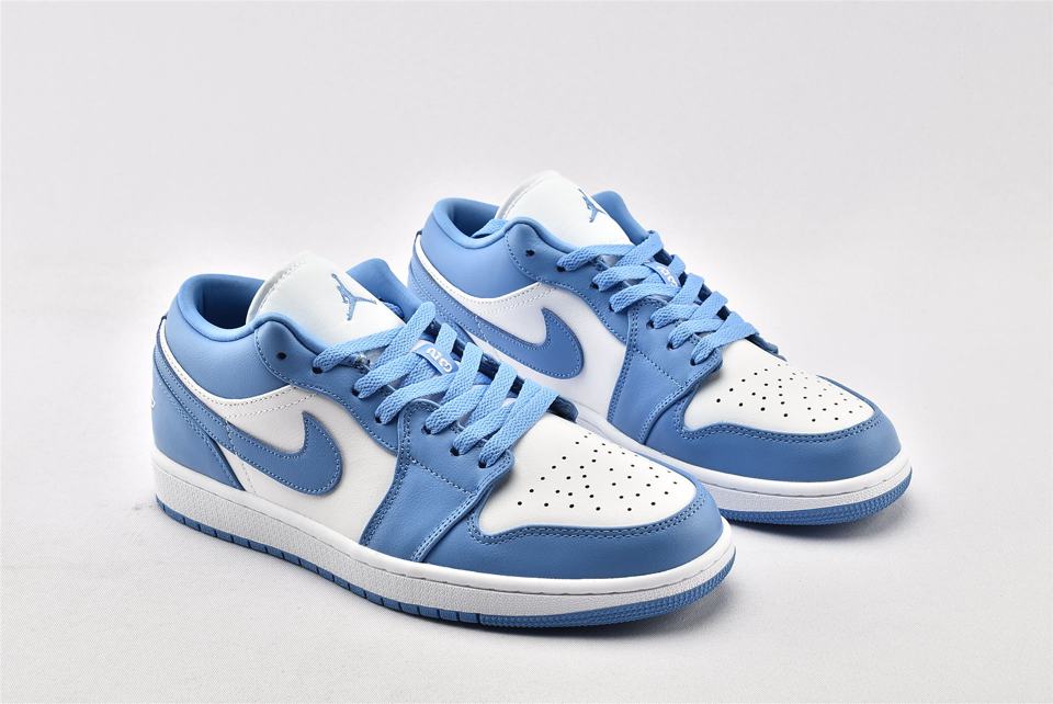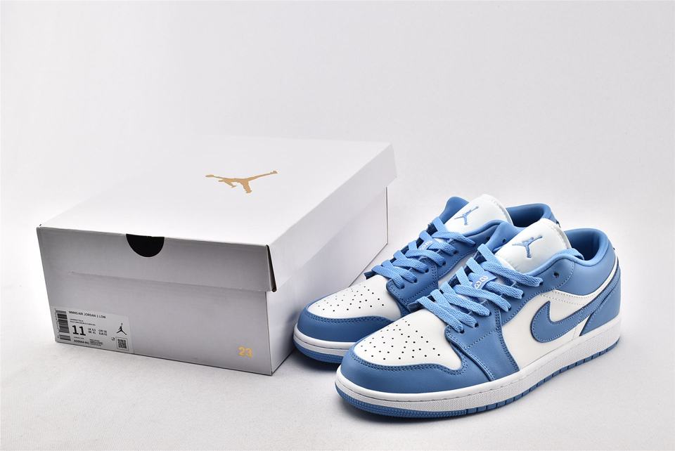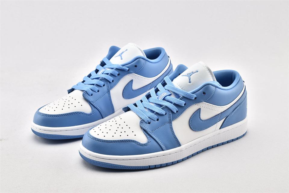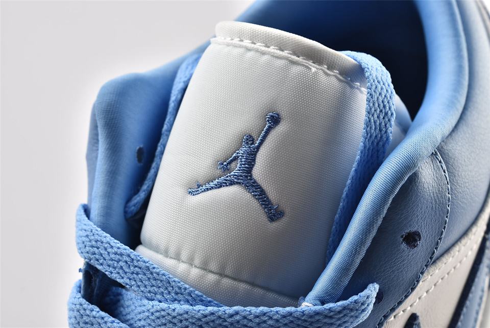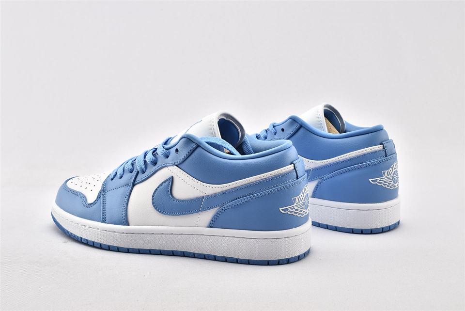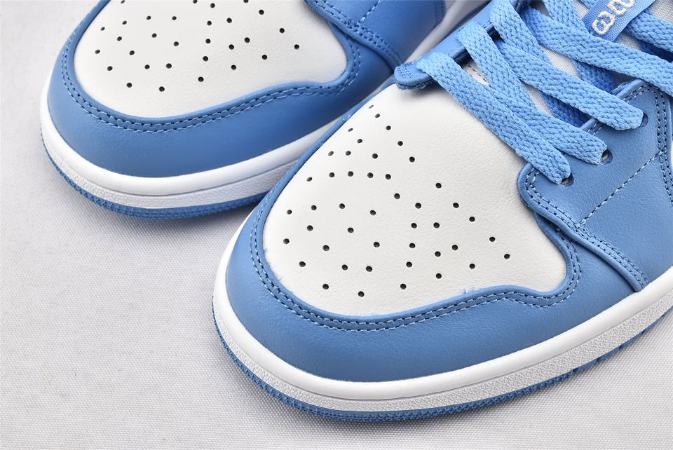 Кроссовки Wmns Air Jordan 1 Low UNC демонстрируют классический силуэт. Верх выполнен из белой кожаной основы с синими накладками. Модель Jordan 1 Low имеет синий Nike Swoosh, белый символ Jumpman на белом нейлоновом язычке и логотип Jordan Wings на пяточной части. Белая мидсоль с технологией Air и синяя подошва завершают дизайн.- Цвета: University Blue/White