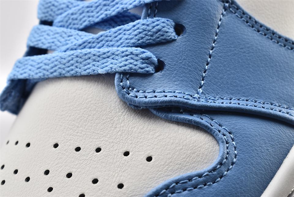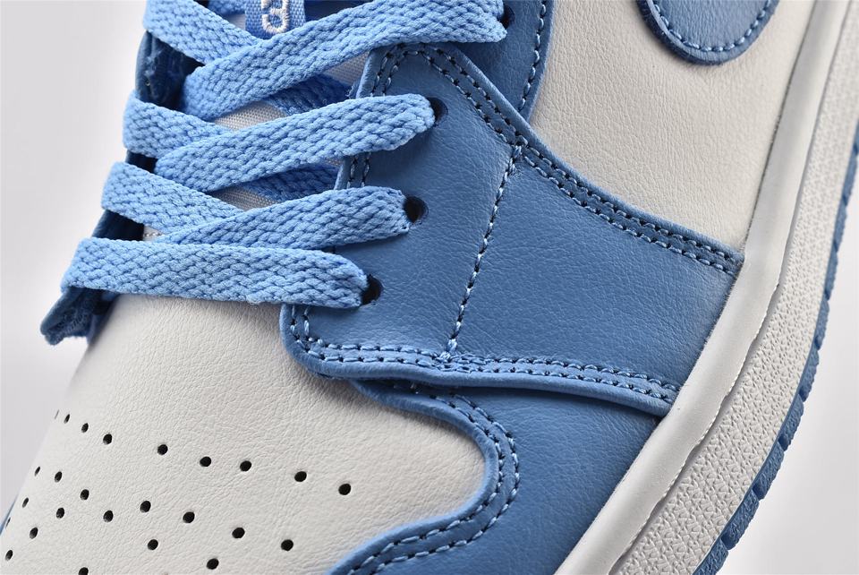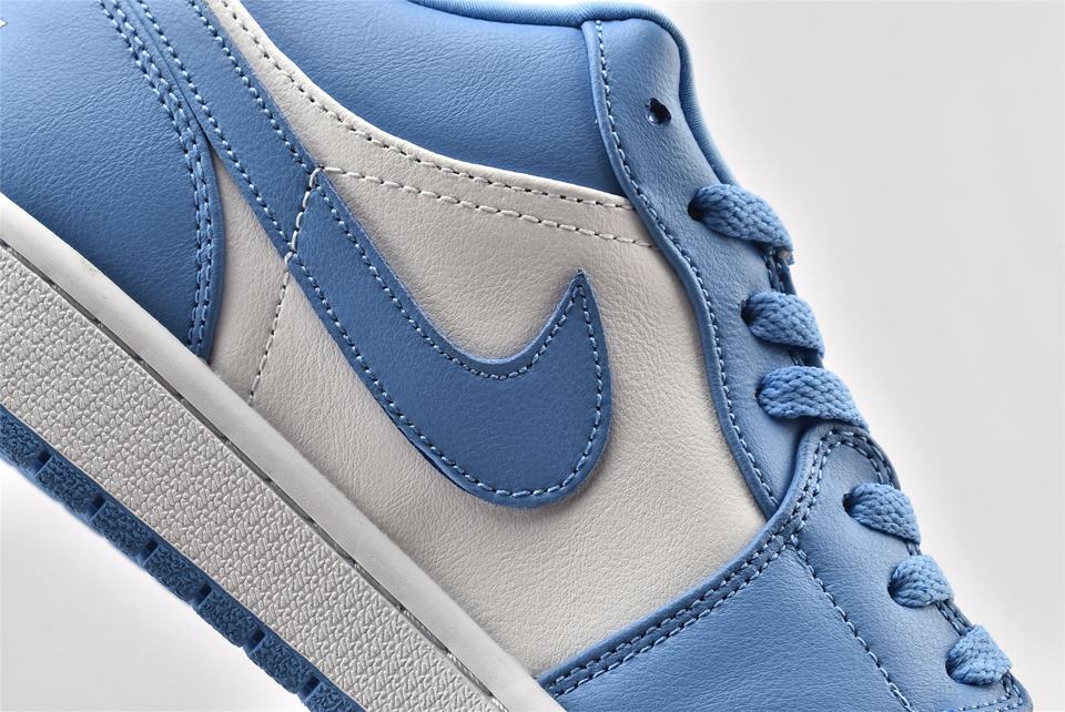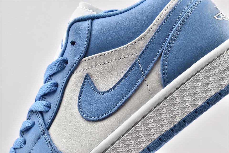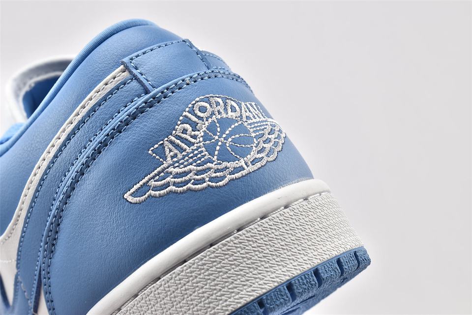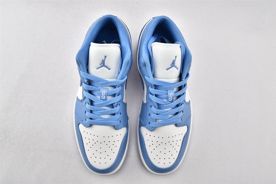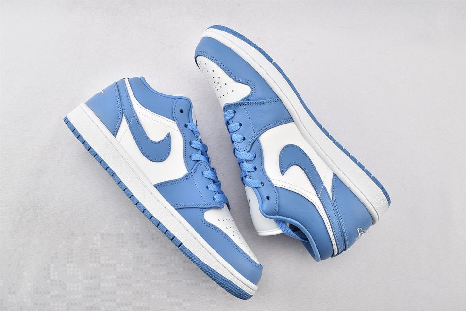 Кроссовки Wmns Air Jordan 1 Low UNC демонстрируют классический силуэт. Верх выполнен из белой кожаной основы с синими накладками. Модель Jordan 1 Low имеет синий Nike Swoosh, белый символ Jumpman на белом нейлоновом язычке и логотип Jordan Wings на пяточной части. Белая мидсоль с технологией Air и синяя подошва завершают дизайн.- Цвета: University Blue/White