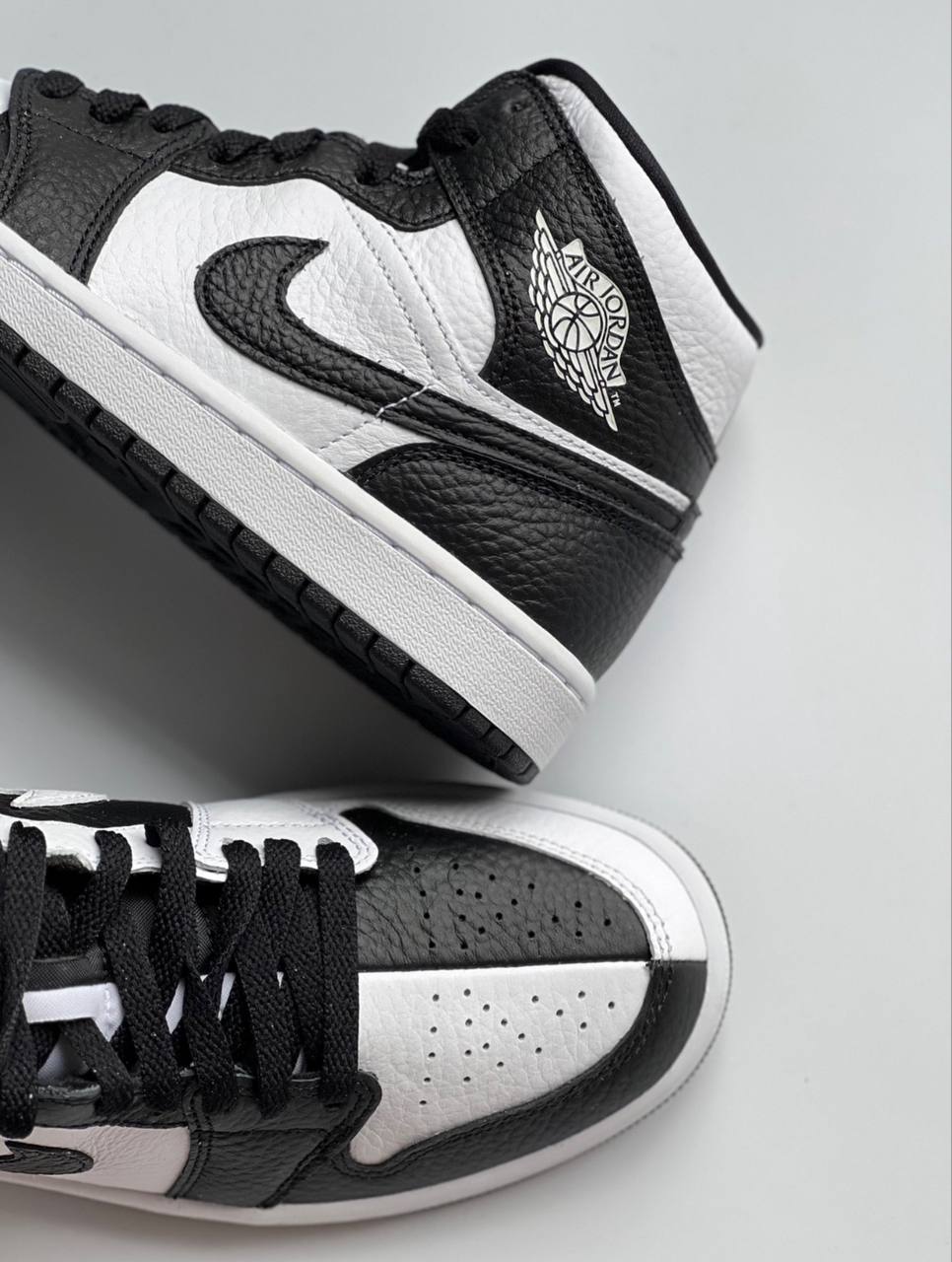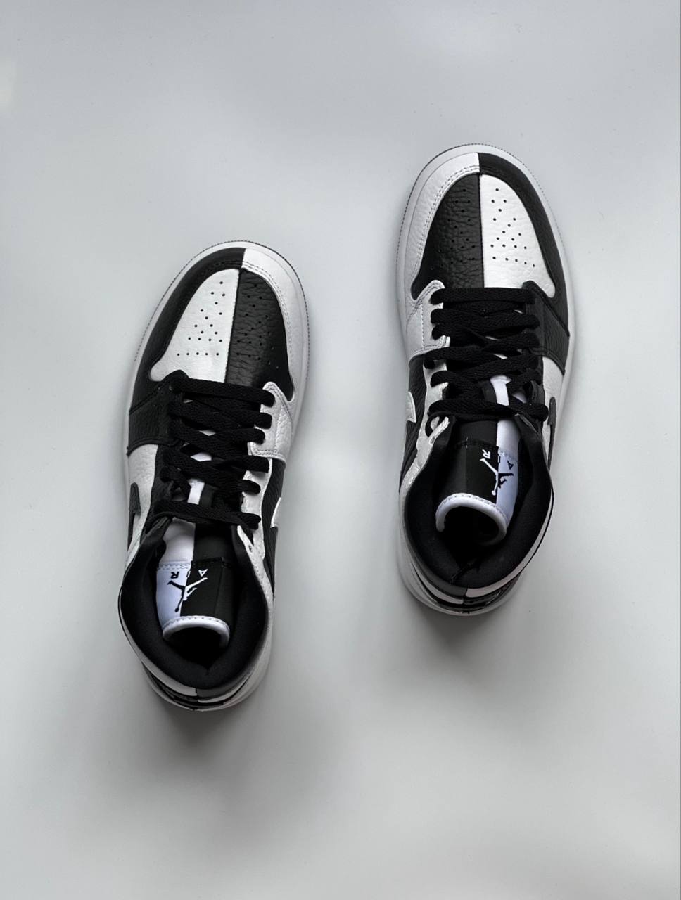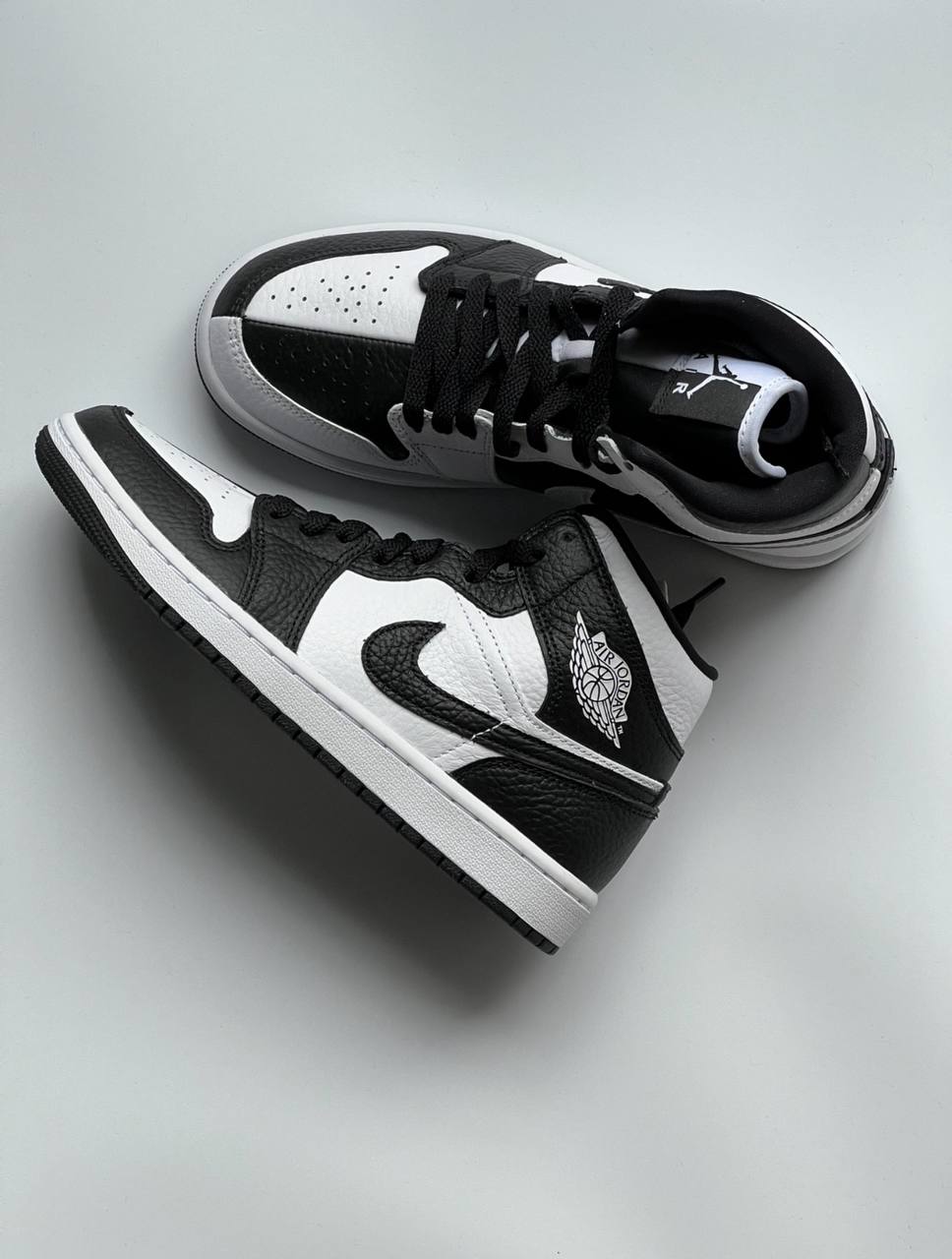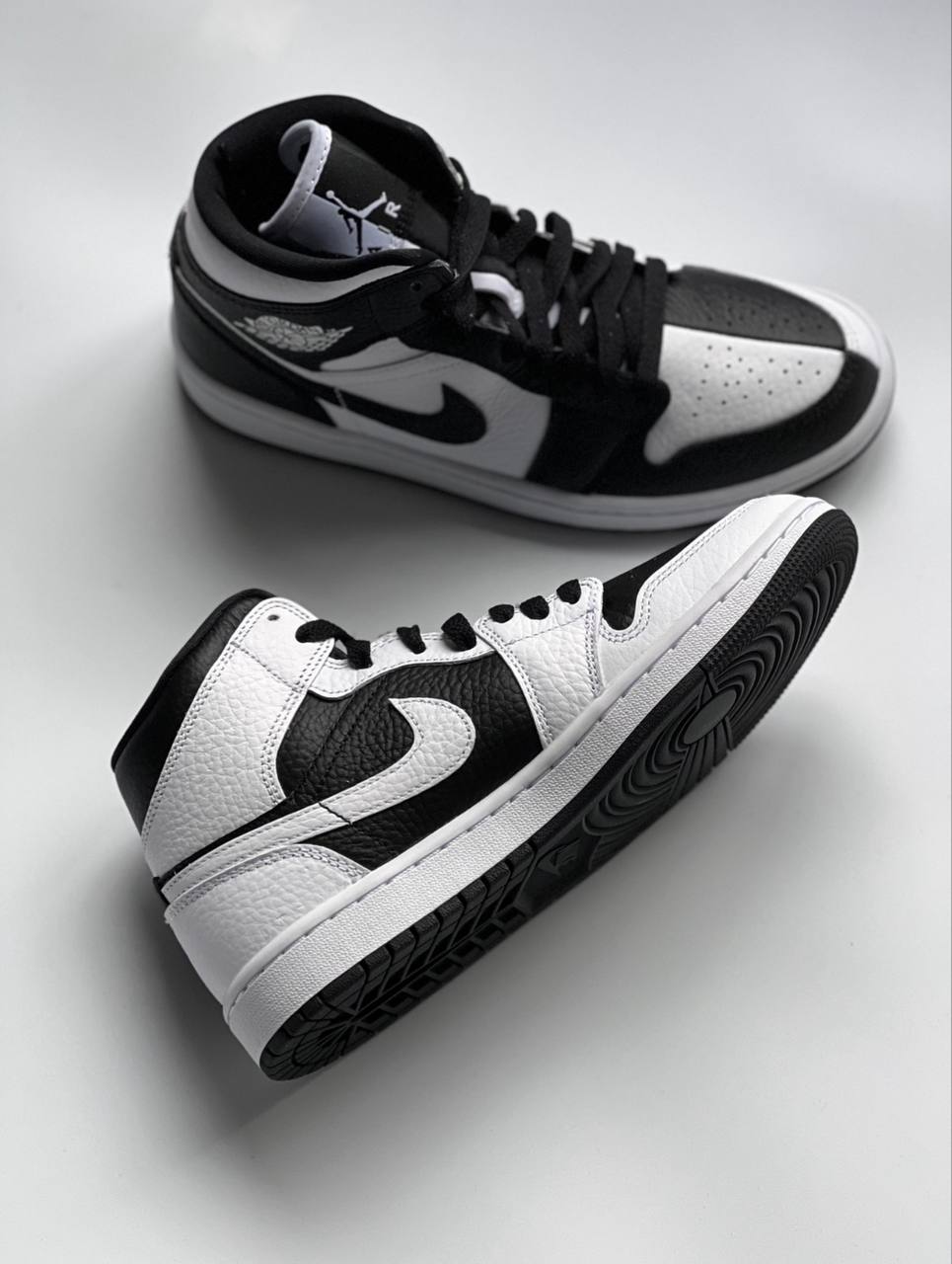 Женские кроссовки Air Jordan 1 Mid SE "Homage" продолжают тему разделенных цветов, использованную в модели "Homage to Home" Jordan 1 High 2018 года. Латеральная сторона верха из галтованной кожи имеет белую основу с контрастными черными накладками, а противоположная сторона сочетает черную основу с белыми накладками. Элементы брендинга включают разделенный язычок Jumpman и напечатанный логотип Wings на боковом отвороте воротника. Мид-топ закреплен традиционной подошвой, подчеркнутой сплошными белыми боковинами и черной резиновой подметкой.