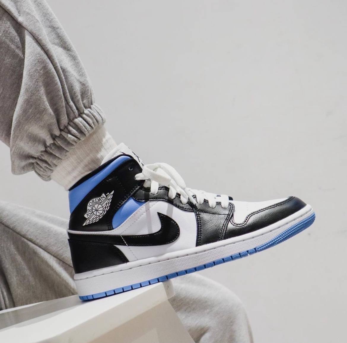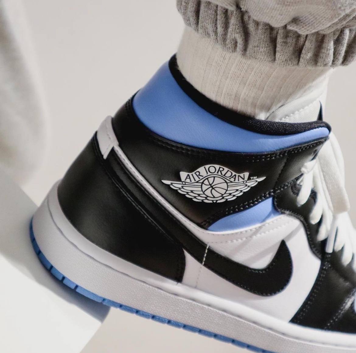Модель Wmns Air Jordan 1 Mid University Blue продолжает любовь бренда Jordan к цветовой гамме UNC. Кроссовки состоят из цветных блоков Black White и University Blue. Гладкие, зернистые черные кожаные накладки составляют большую часть кроссовок, а вставки из кожи университетского синего цвета на воротнике добавляют контраста. Белая кожаная подкладка завершает дизайн.- Цвета: White/University Blue/Black