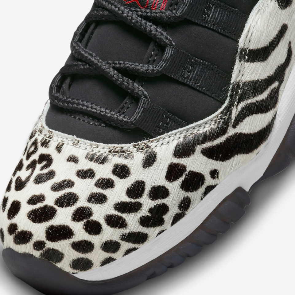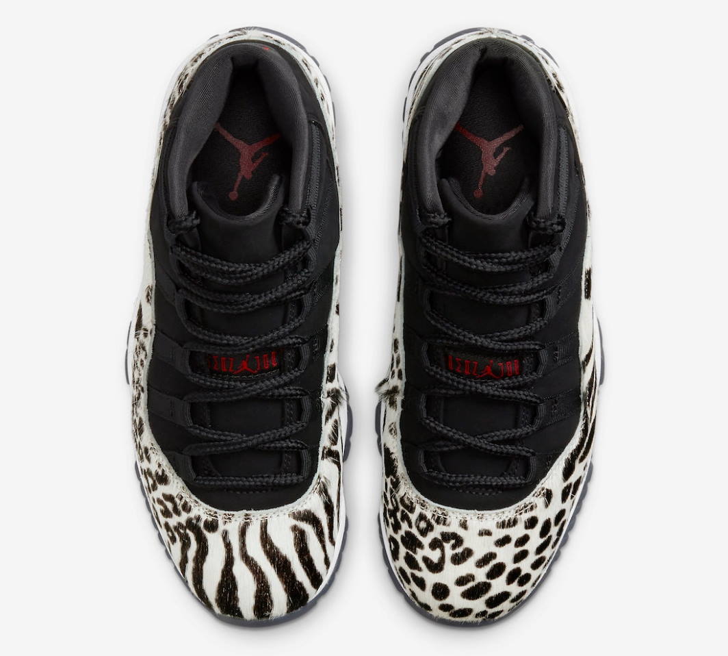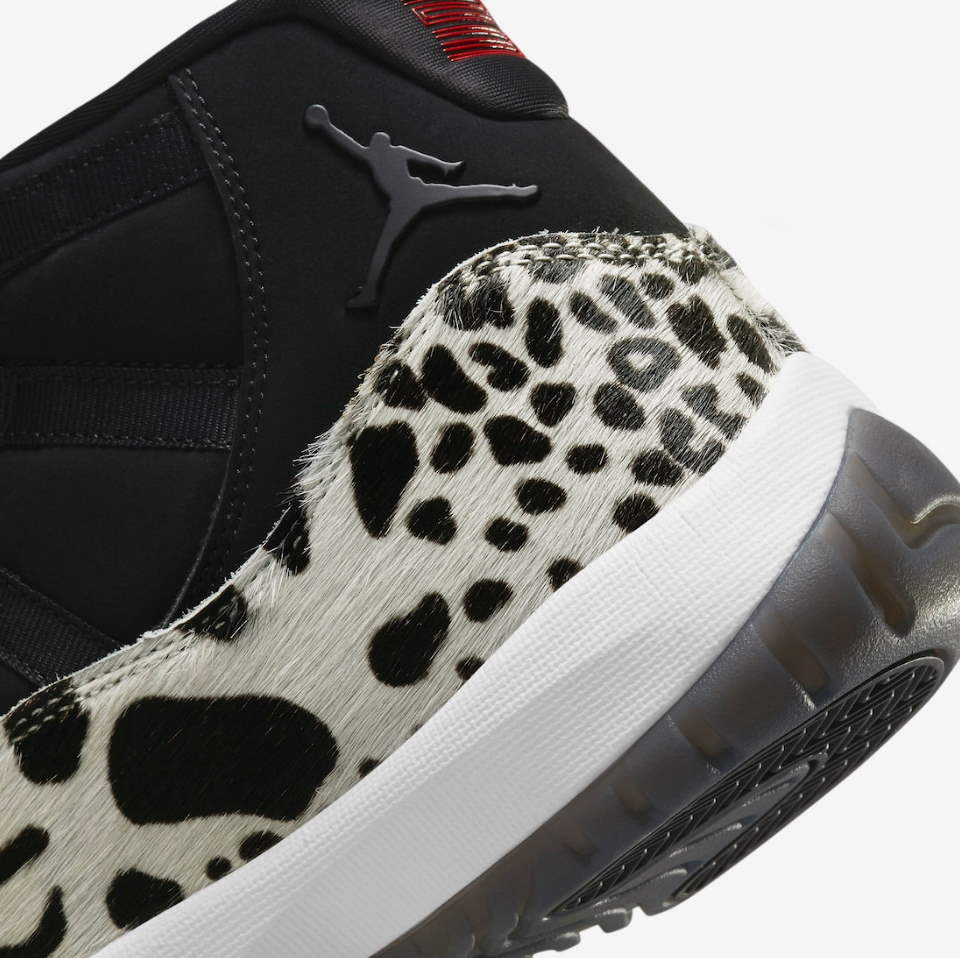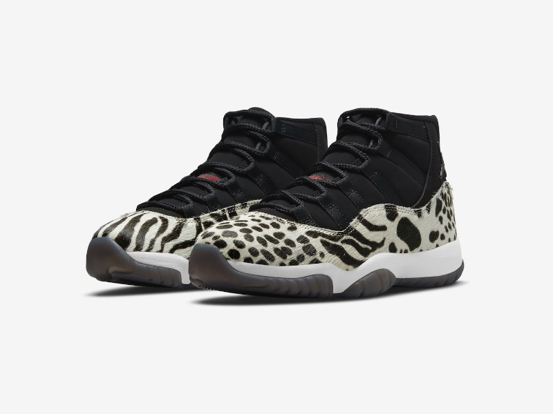 Женский релиз Air Jordan 11 Retro «Animal Instinct» изменяет оригинальный дизайн Tinker Hatfield 1995 года с расцветкой, вдохновленной дикой природой. Фирменная лакированная кожаная накладка в средней части заменена пушистым наложением цвета слоновой кости, отделанным попурри из гепардов, леопарда и зебр в черном цвете. Остальная часть верха построена из черного нубука с тональными кружевными петлями и приподнятым логотипом Jumpman на боковой лодыжке. Контрастные малиновые акценты оседают на стилизованной цифре «23», напечатанной на пятке, и мини-Jumpman на языке. Кроссовки установлены на белой мидсоли Phylon, оснащенной полноразмерным блоком Nike Air, и дымчатой полупрозрачной резиновой подошвой.- Цвета: Black/Gym Red/Sail/White
